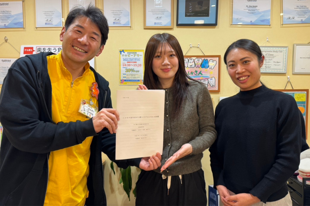 本研究は、池田市のこいし・こども矯正歯科様のご協力のもと、「こどもの食生活が口腔トラブルに与える影響」をテーマとして実施し、その研究成果を院長 小石 剛 先生にご報告いたしました。