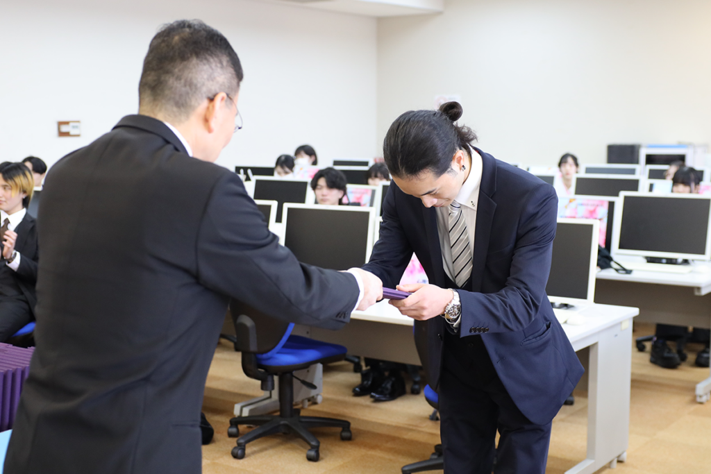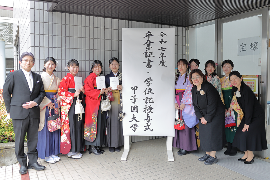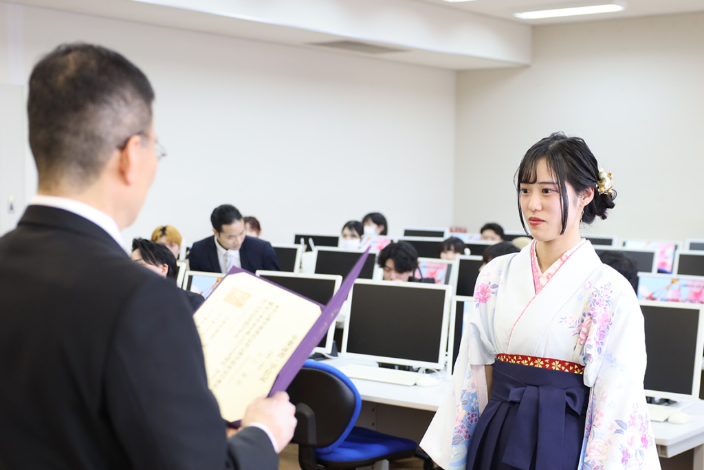 全体での記念撮影の後、各学部学科で卒業証書・学位記をあらためて一人ひとりに手渡しました。