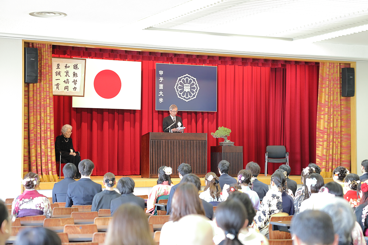 尾﨑学長より社会への門出を祝う式辞を受けた学部生72名、大学院生6名が巣立ちました。