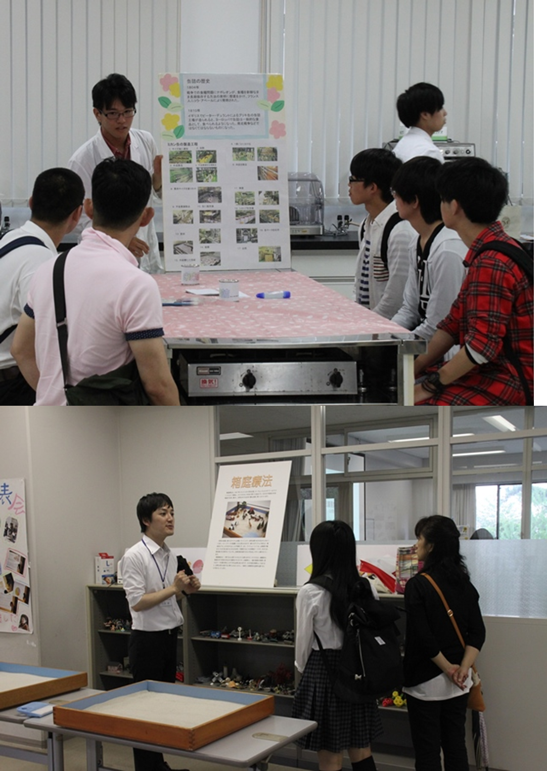 心理学部では「ストレスを測ろう、箱庭療法、性格テスト体験」、「アニマルセラピー体験」などのイベントがあり、セラピー犬が良かったとのご感想をいただきました。