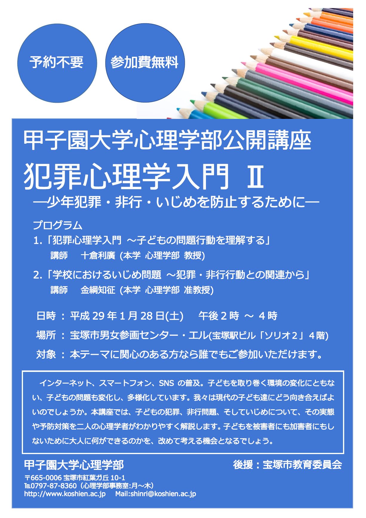 2017年1月28日(土)に公開講座「犯罪心理学入門Ⅱ-少年犯罪・非行・いじめを