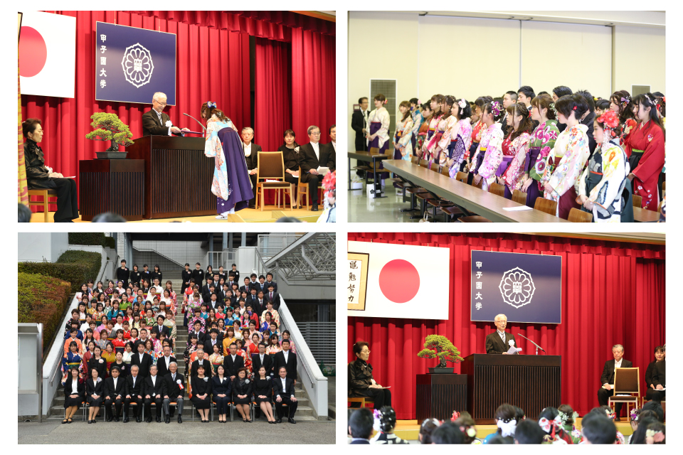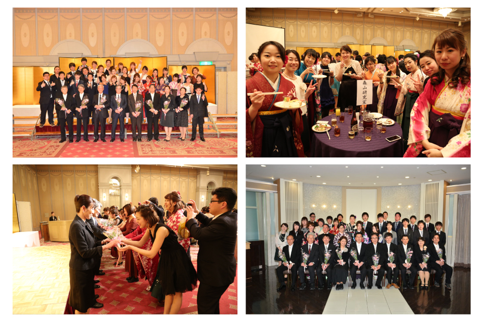 川合学長より社会への門出を祝う式辞を受けた学部生162名、大学院生7名が巣立ちました。 また、卒業式後、卒業生主催による卒業記念パーティが宝塚ホテルで盛大に行われました。会場では、お世話になった先生方と記念撮影をする光景が見られるなど、新しい門出にふさわしい華やかな席となりました。