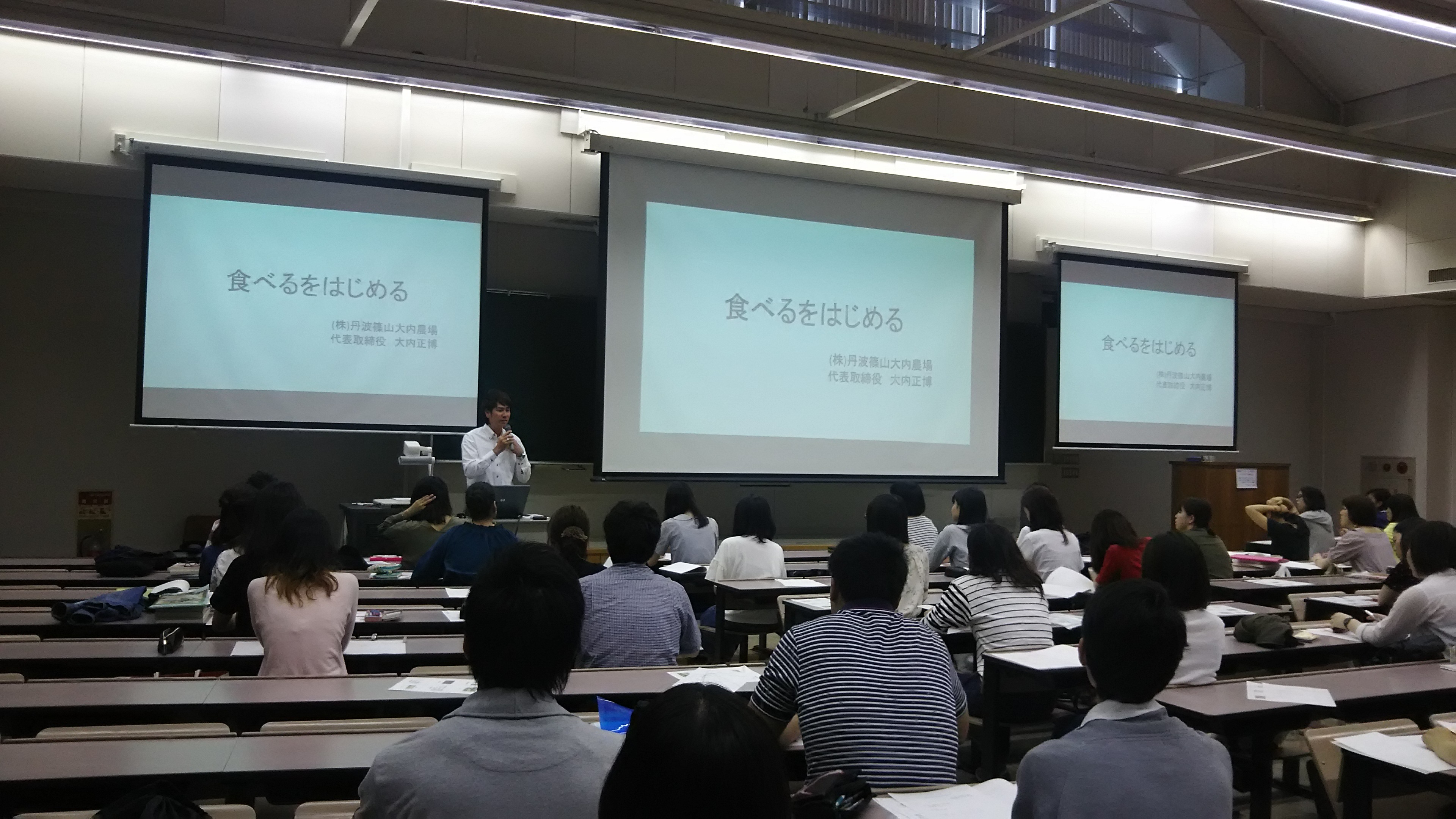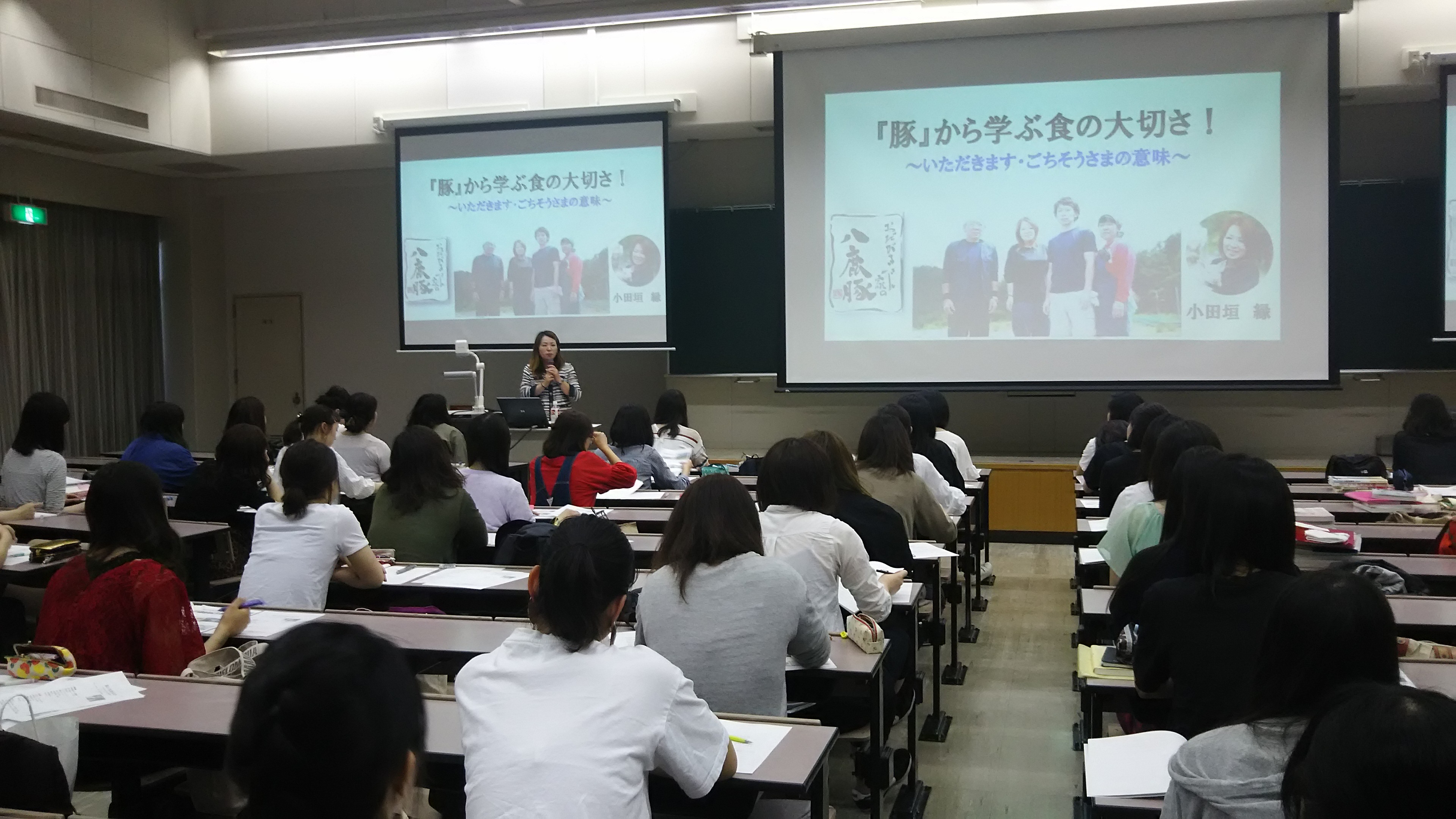 将来管理栄養士等を目指す栄養学科3回生の「食育実践演習」履修学生が、6月5日(月)には都倉貴博さんによる「流通の持つ意味」と小田垣緑さんによる「豚から学ぶ食の大切さ」を、同12日(月)には大内正博さんによる「米・黒豆の栽培、流通」と黒田美福さんによる「レタスの生産・収穫・出荷」の内容で、座学を行いました。