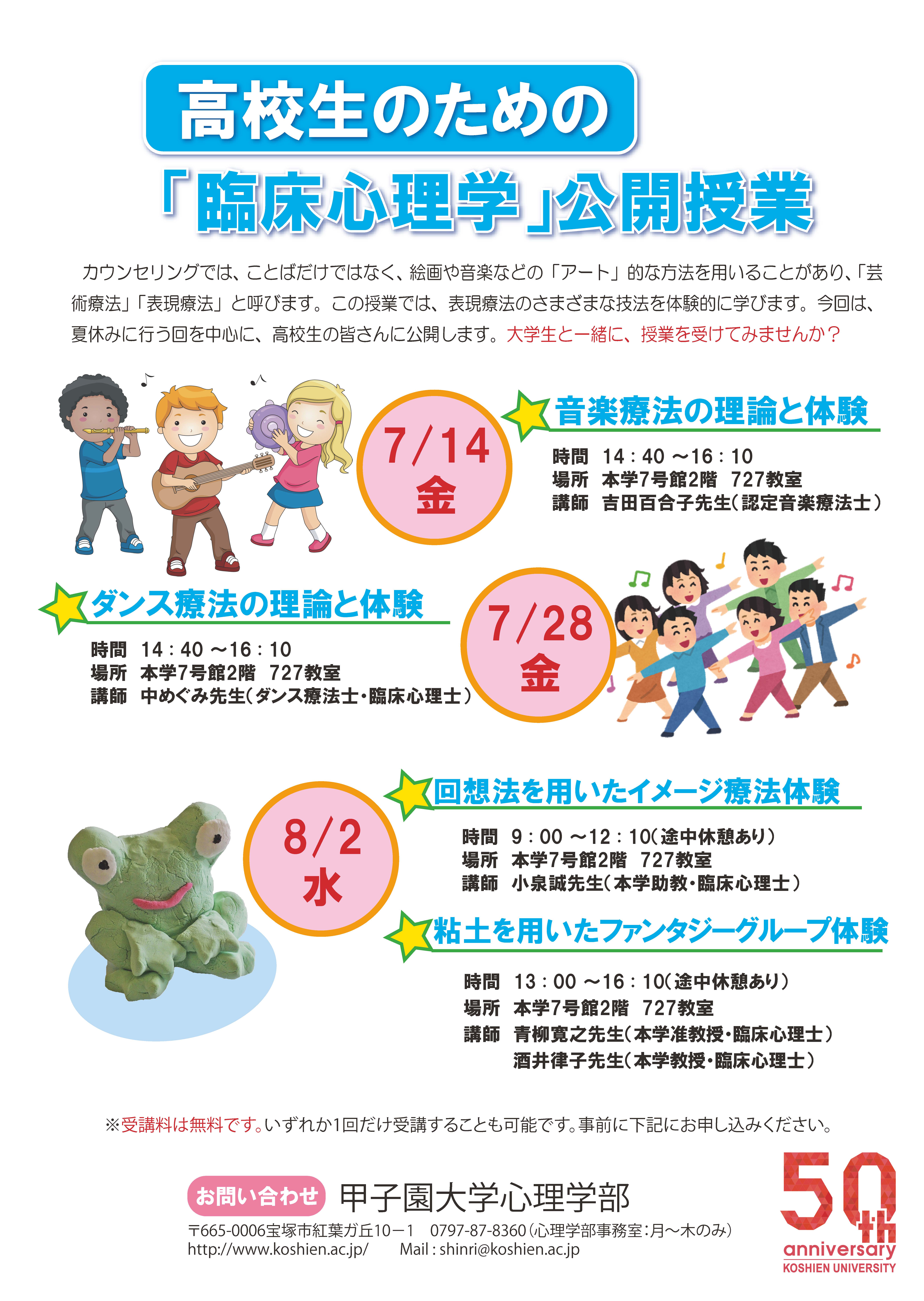 心理学部では、この夏、「臨床心理学」の授業を高校生のみなさんに公開します。参加費は無料で、高校生のどなたでも参加できます。音楽療法、ダンス療法、イメージ療法、粘土を用いたファンタジーグループなど、さまざまなセラピーの技法を楽しく体験しながら学びます。いずれか1コマの授業だけを受講することも可能です。大学生と一緒に授業を受けてみませんか? 高校生のみなさんのご参加をお待ちしております。