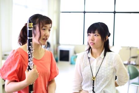 昼休みの取材に、20人近いメンバーが集まりました。早速、吹奏楽の定番「オーメンズ・オブ・ラブ」を披露してくれたのですが、これがなかなかの腕前です! 部長の澁川奈穂さん(栄養学科3回生、クラリネット担当)曰く、いろいろな楽器で一つの音楽を作り上げていく一体感を持てるのが吹奏楽の魅力だそうです。