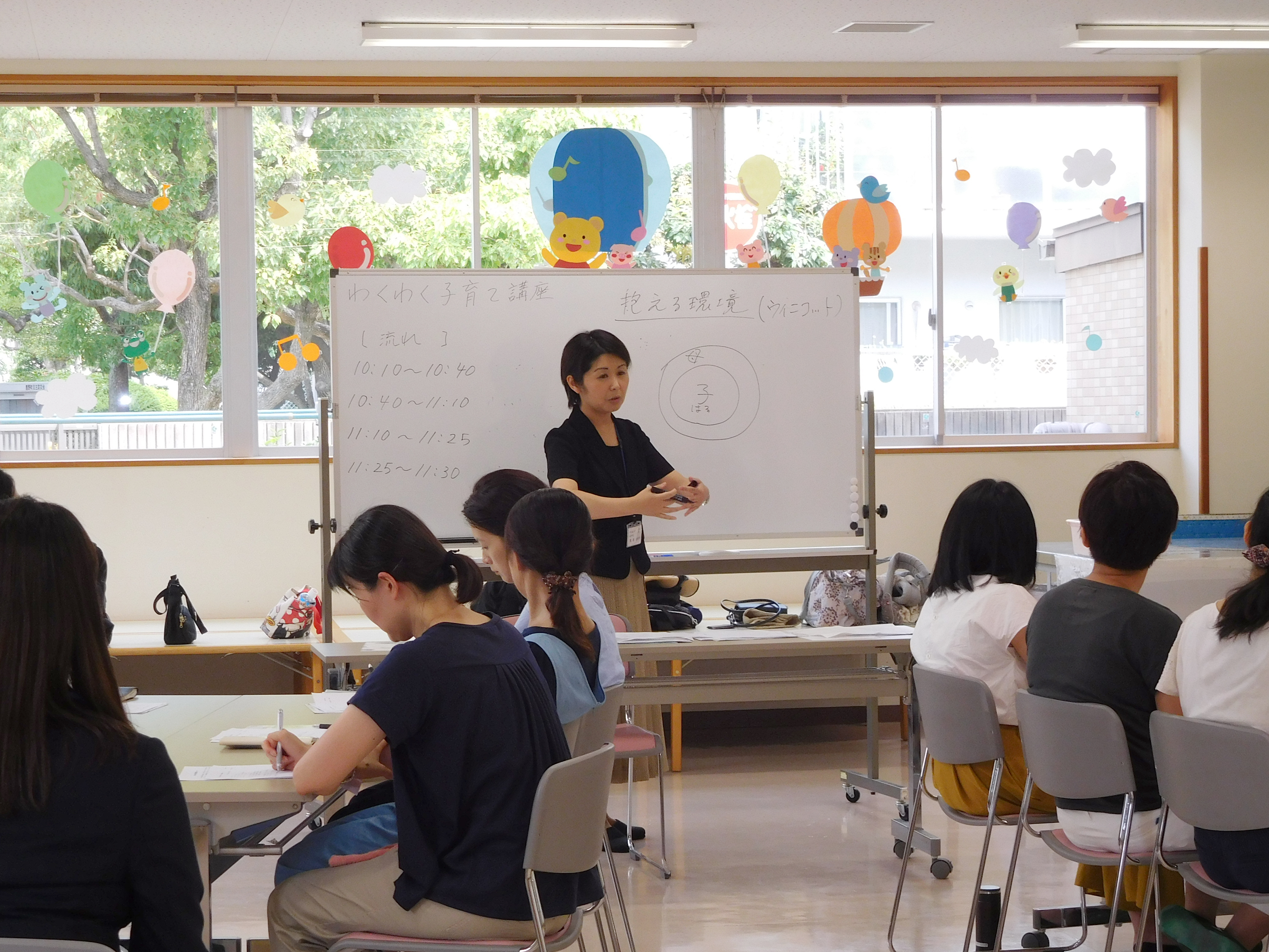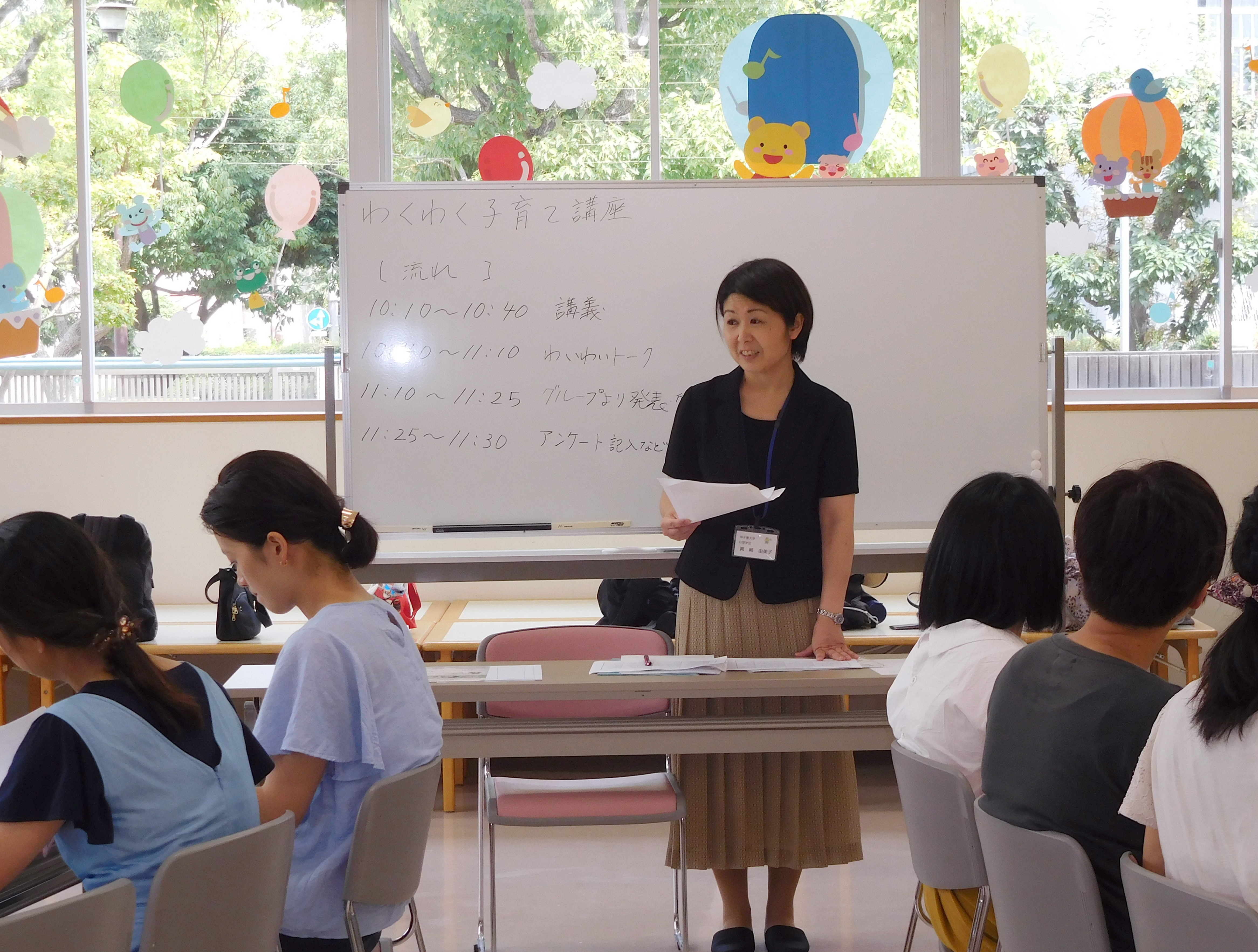 初めての1歳児を子育て中の保護者の方を対象とした「わくわく子育て講座」の1回目を8月23日(水)、甲子園学院幼稚園で開催しました。この講座は、計3回を予定していましたが、多くの皆さまにお申し込みいただき、各回12人の定員はすぐに満員となりました。