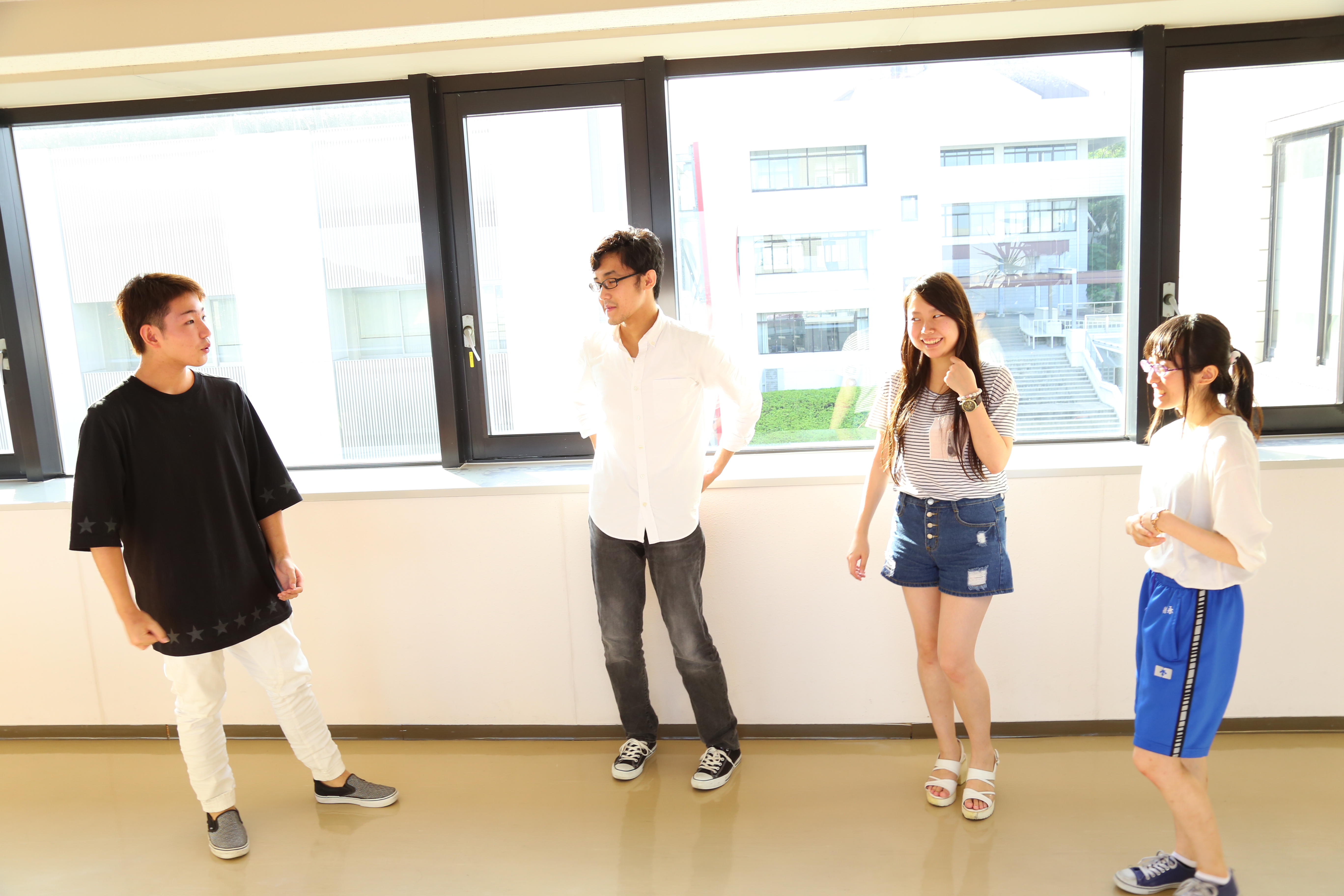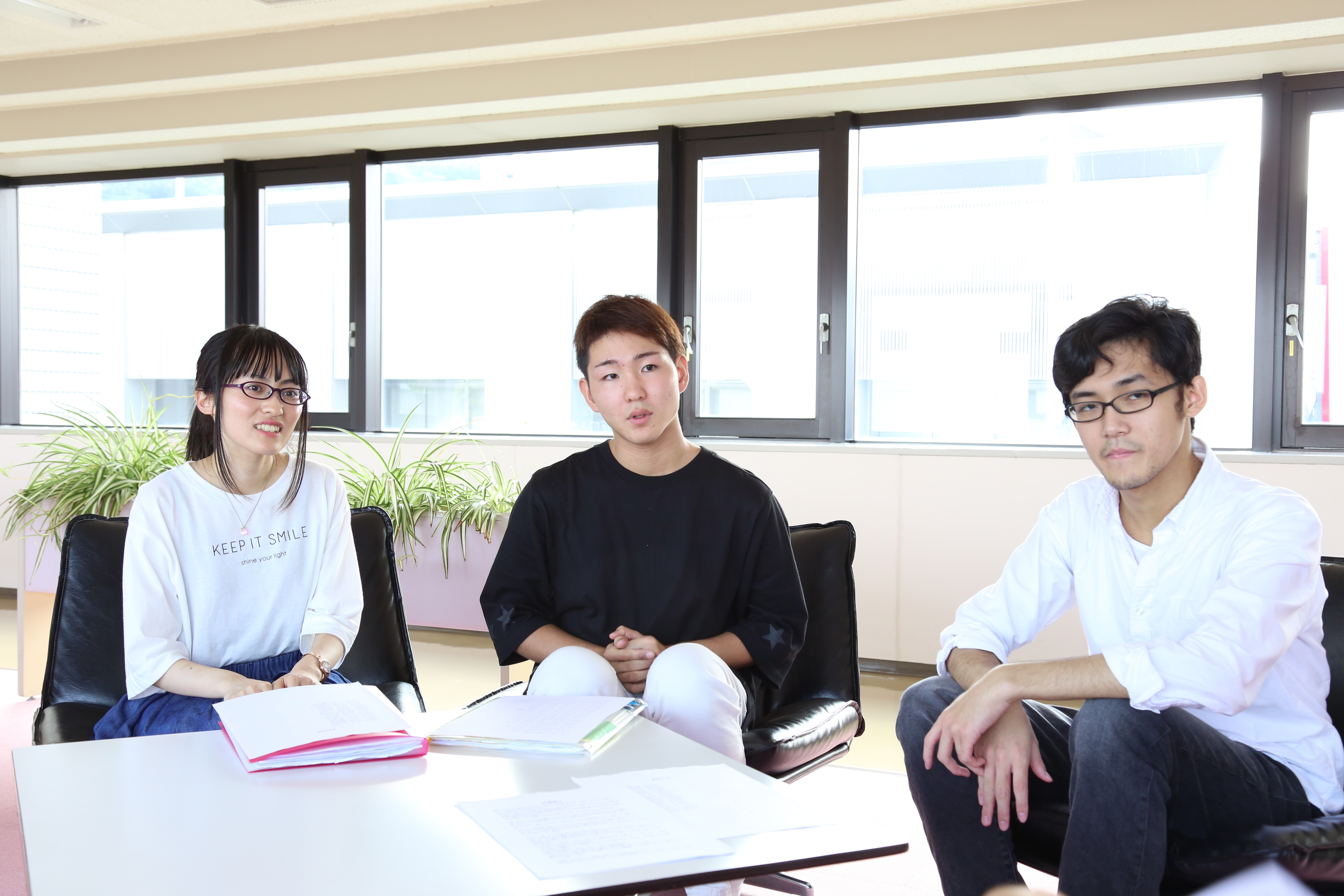 高校時代に演劇部で活動していた望月信之介君(心理学部1回生)が、今年5月に本学に新たに立ち上げました。現在12人の部員のうち、放課後の取材に集まってくれたのは部長の望月君、副部長の徳永琳さん(心理学部1回生)、梶原瑛洋君(心理学部1回生)、石山七虹さん(栄養学部栄養学科3回生)の4人です。
