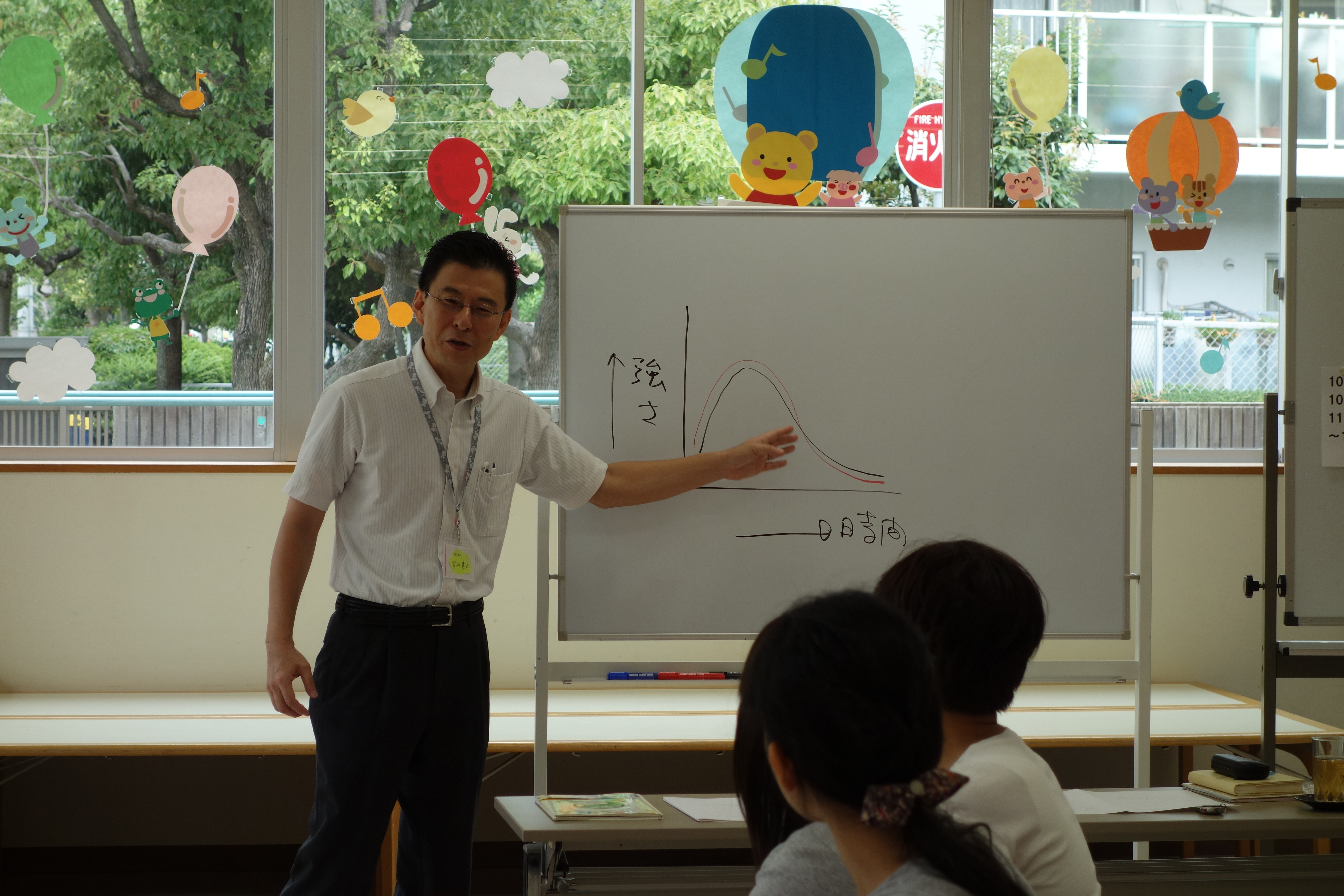この日も12人のお母さま方がお越しになり、甲子園大学心理学部の青柳寛之准教授の「親子の波長合わせ」をテーマとした講義に熱心に耳を傾けておられました。その後、お母さま方は2つのグループに分かれ、お互いに子育ての経験を分かち合う「わいわいトーク」を行いました。日頃の子育ての悩みを共有したり、各家庭で工夫しておられる実践法を披露したり、会場は大いに盛り上がりました。