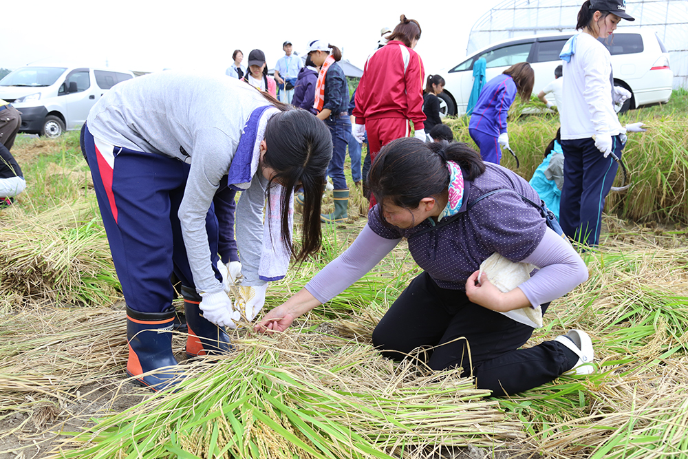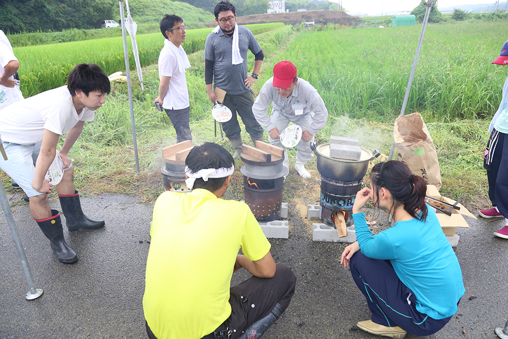 刈った稲を束ね、竿に干した後は、ブリキ缶でもみ殻を入れてつくる炊飯方法を学習。近くの畑で獲れた夏野菜の味噌汁とおむすびを昼食にしました。食べ物を大切にする心、電気やガスがなくても米をおいしく炊ける方法を学ぶなど学生にとって「収穫」の多い一日でした。