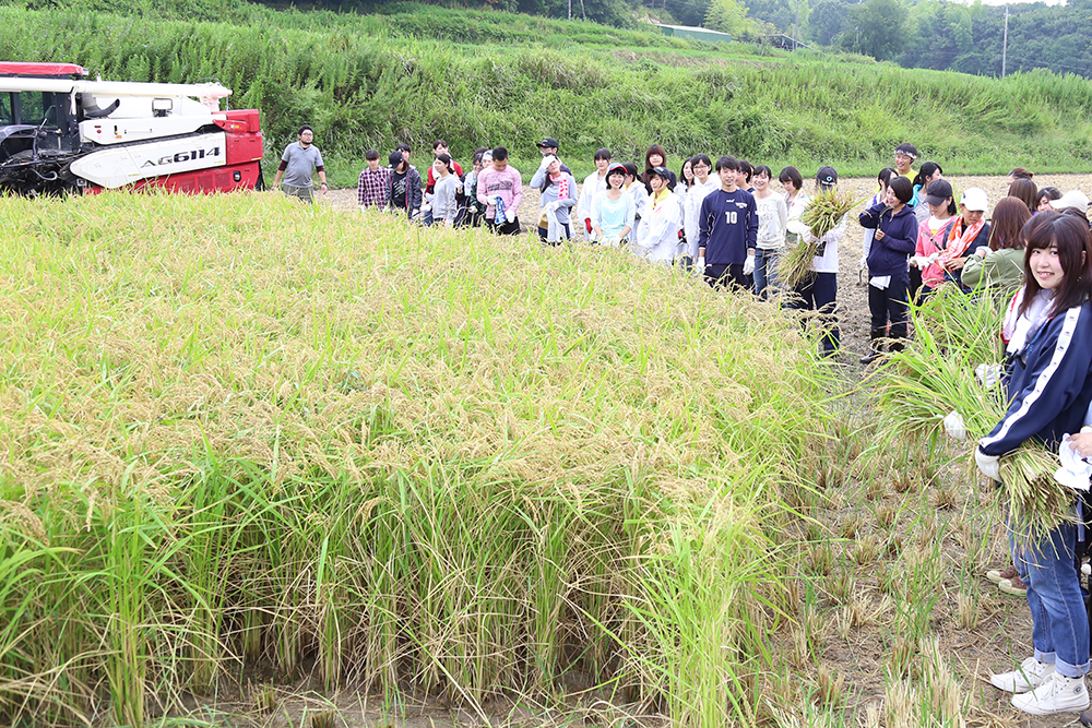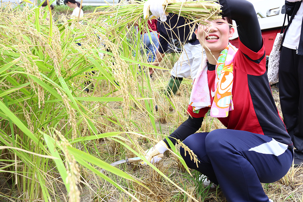 栄養学部栄養学科3回生48人が、9月7日(木)、神戸市西区の小池農園で、「たべるをはじめる会」と「公益社団法人兵庫みどり公社」の協力を得て、稲刈りに初挑戦しました。