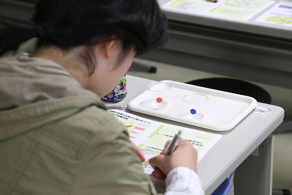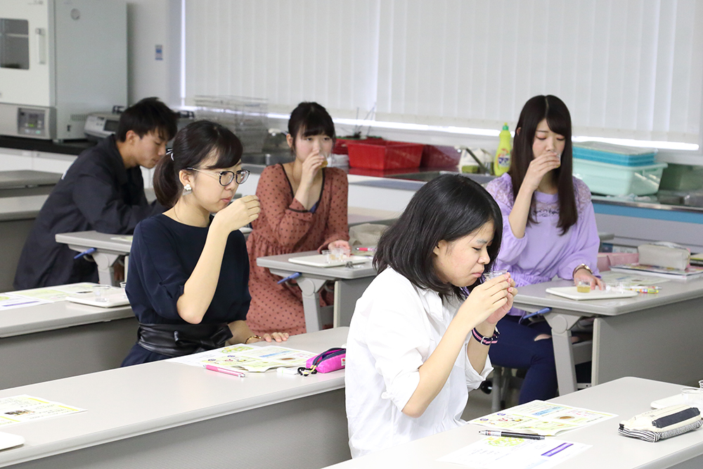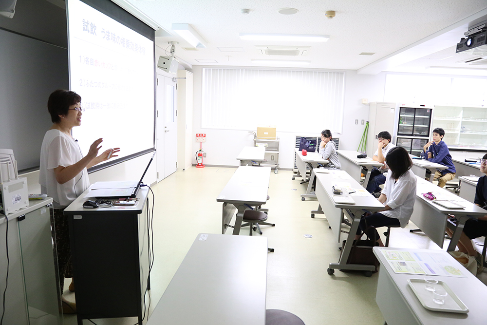 まずは「うま味」の相乗効果について、実際に官能評価を行って体験。食塩の摂取量を減らすためにも、うま味を活かした食事の提供は、今後ますます重要になることを学びました。「商品開発とは」の授業では、味の素における商品開発の流れを例に、商品が消費者に届くまでの説明を受けました。最後に、管理栄養士・栄養士をめざす学生への熱いメッセージとアドバイスもいただきました。学生たちからも質問が相次ぐ、充実した講義でした。