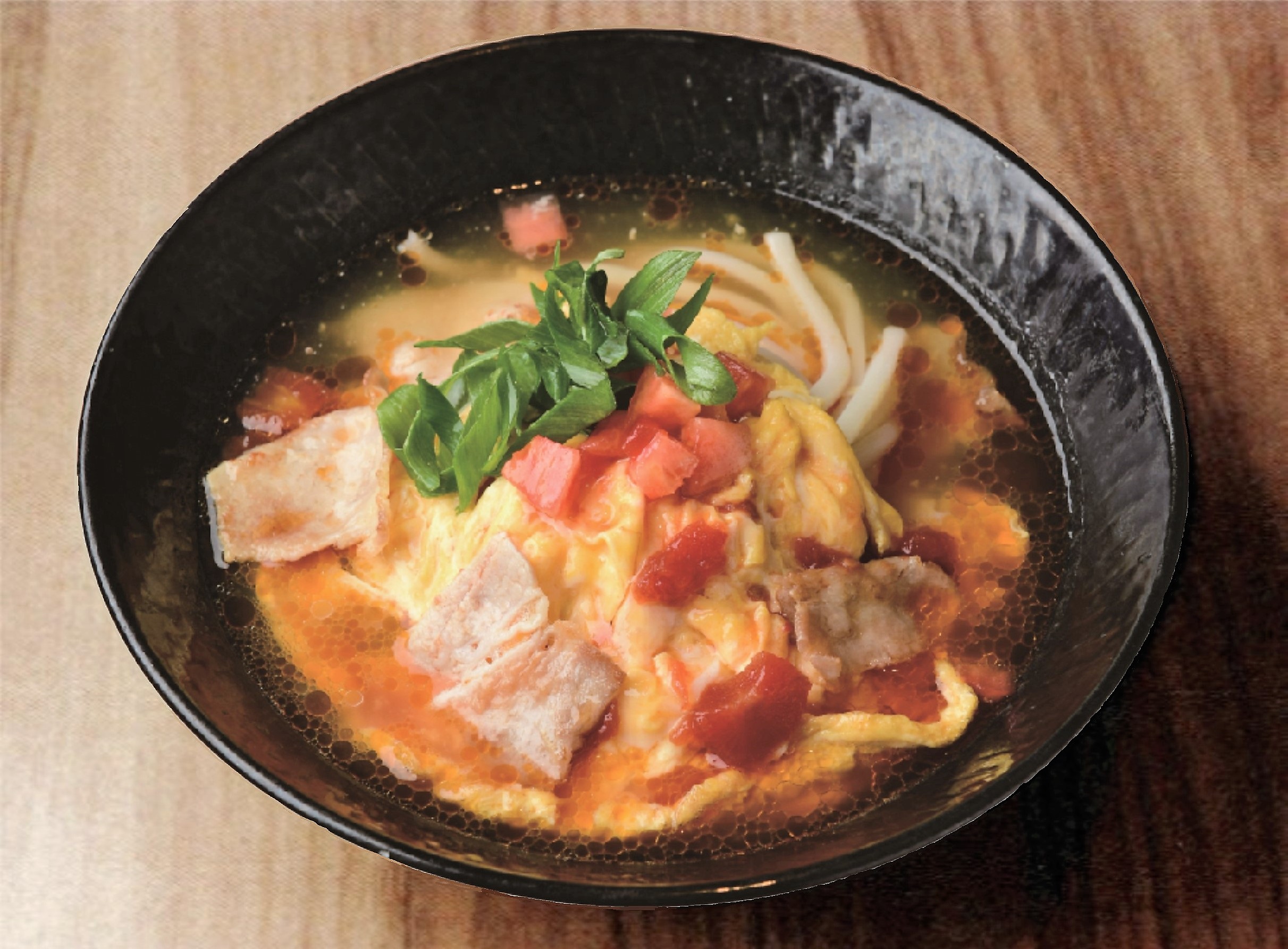 ふわふわとろとろに軽く焼いた玉子からの甘みとトマトの酸味、豚バラ肉のコクと旨味が混ざり合う絶妙な味わいにおろし生姜を加え、とろみをつけた風味豊かなあんだしをごま油で仕上げ、彩りも良くお召し上がり頂けます。