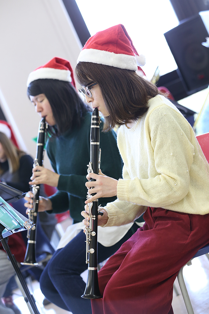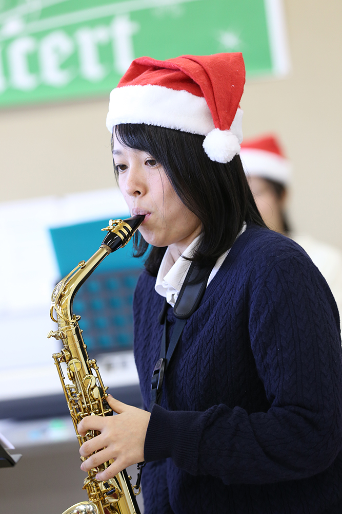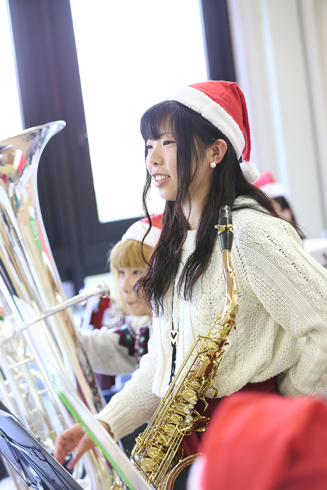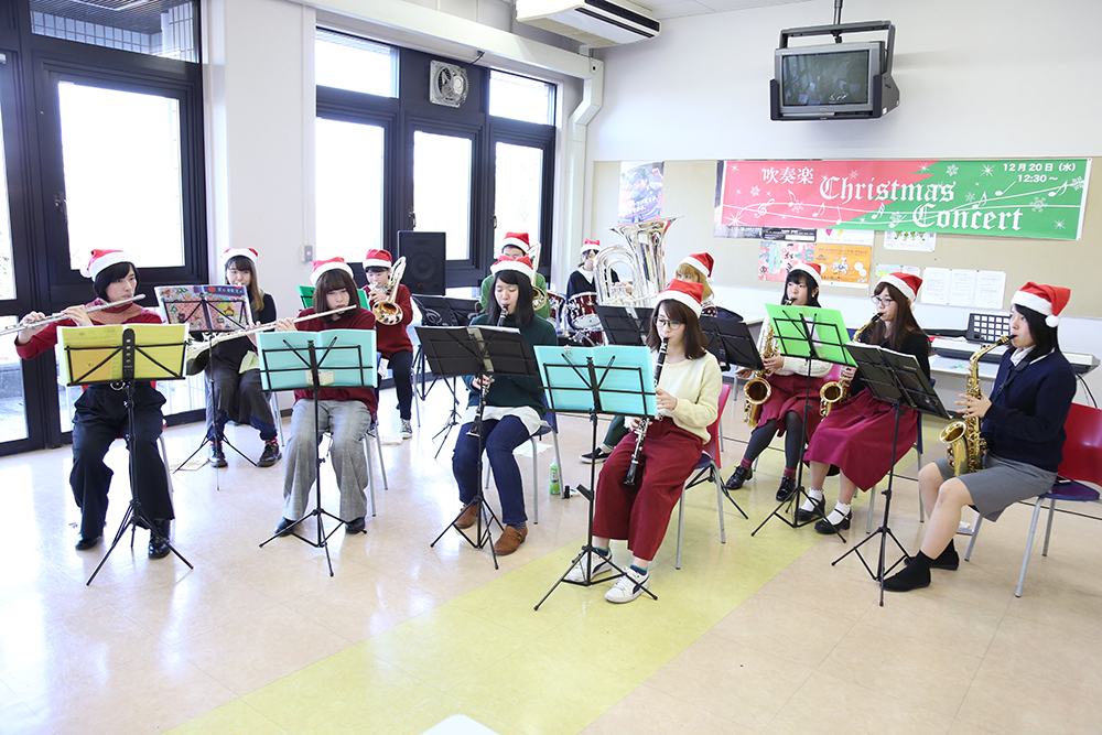 12月20日(水)昼休み、本学食堂前の学生ホールにて、吹奏楽部による「クリスマスコンサート」が開催されました。今年で第2回目となるこのコンサートでは、「クリスマスソングメドレー」「冬の童謡メドレー」「恋人たちのクリスマス」を演奏しました。コンサートに合わせて、食堂では「クリスマス特別ランチ」を用意。ホールに集まった学生、教職員は特別ランチを食べながらますます息の合った演奏に耳を傾け、一足早く、クリスマス気分を味わいました。