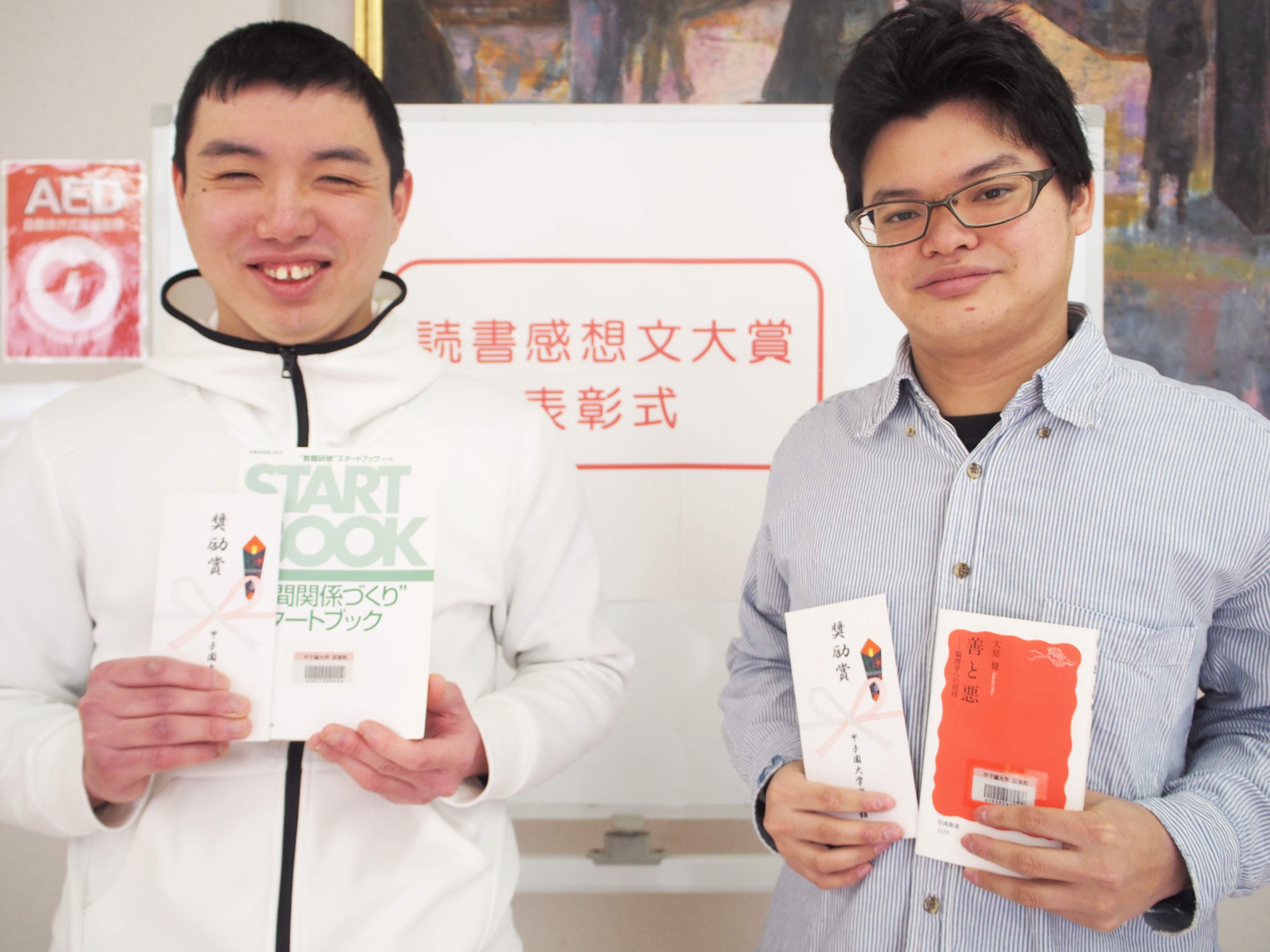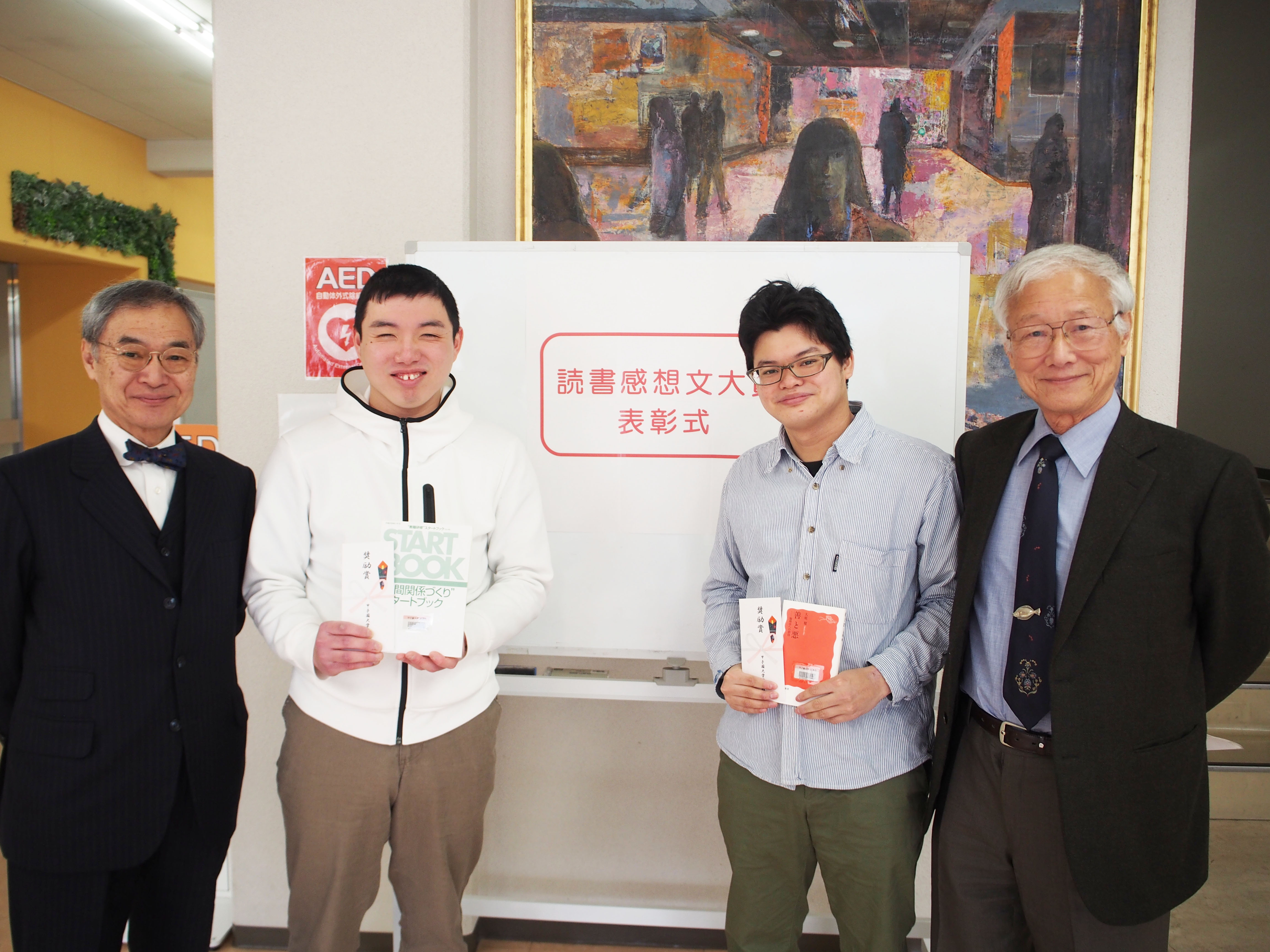 第一回読書感想文大賞に心理学部3回生の上畑佑真さん、田中翼さんの二人が選ばれ、1月31日に表彰式を行いました。この賞は、読書をする楽しみを学友と共に分かち合ってもらいたいという中村秀雄学長の願いのもとに今回、新設されました。