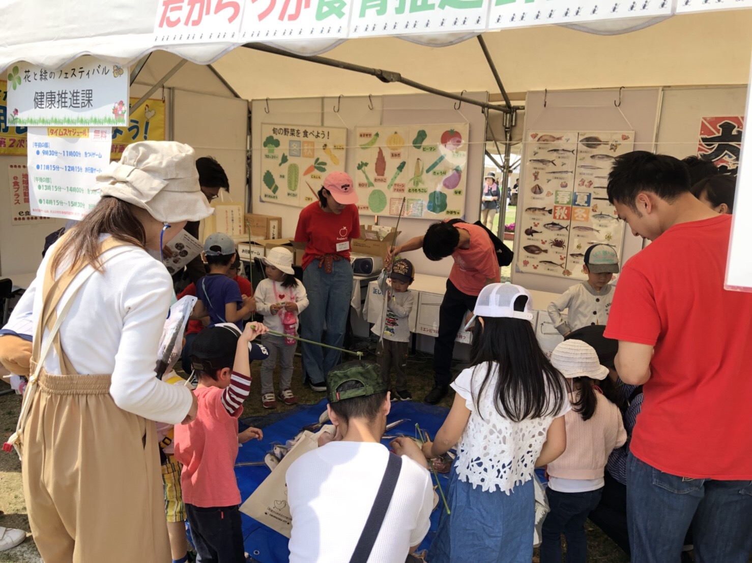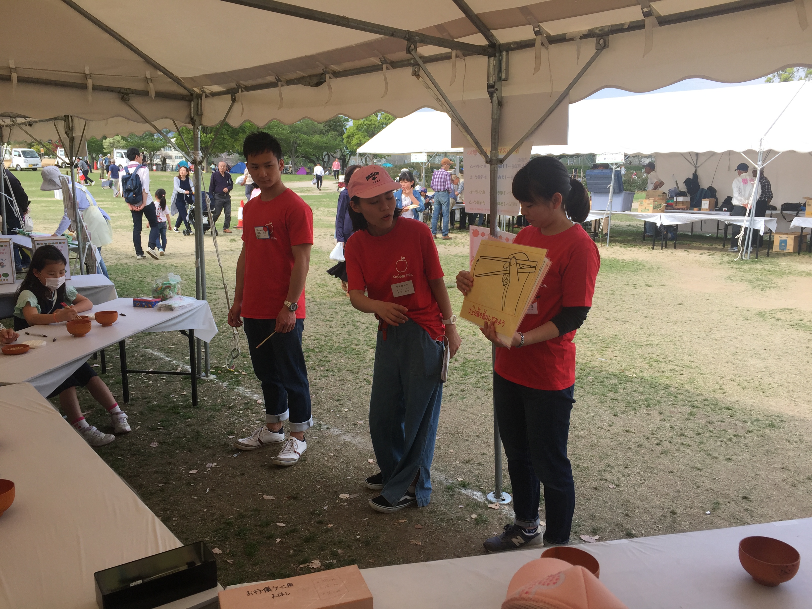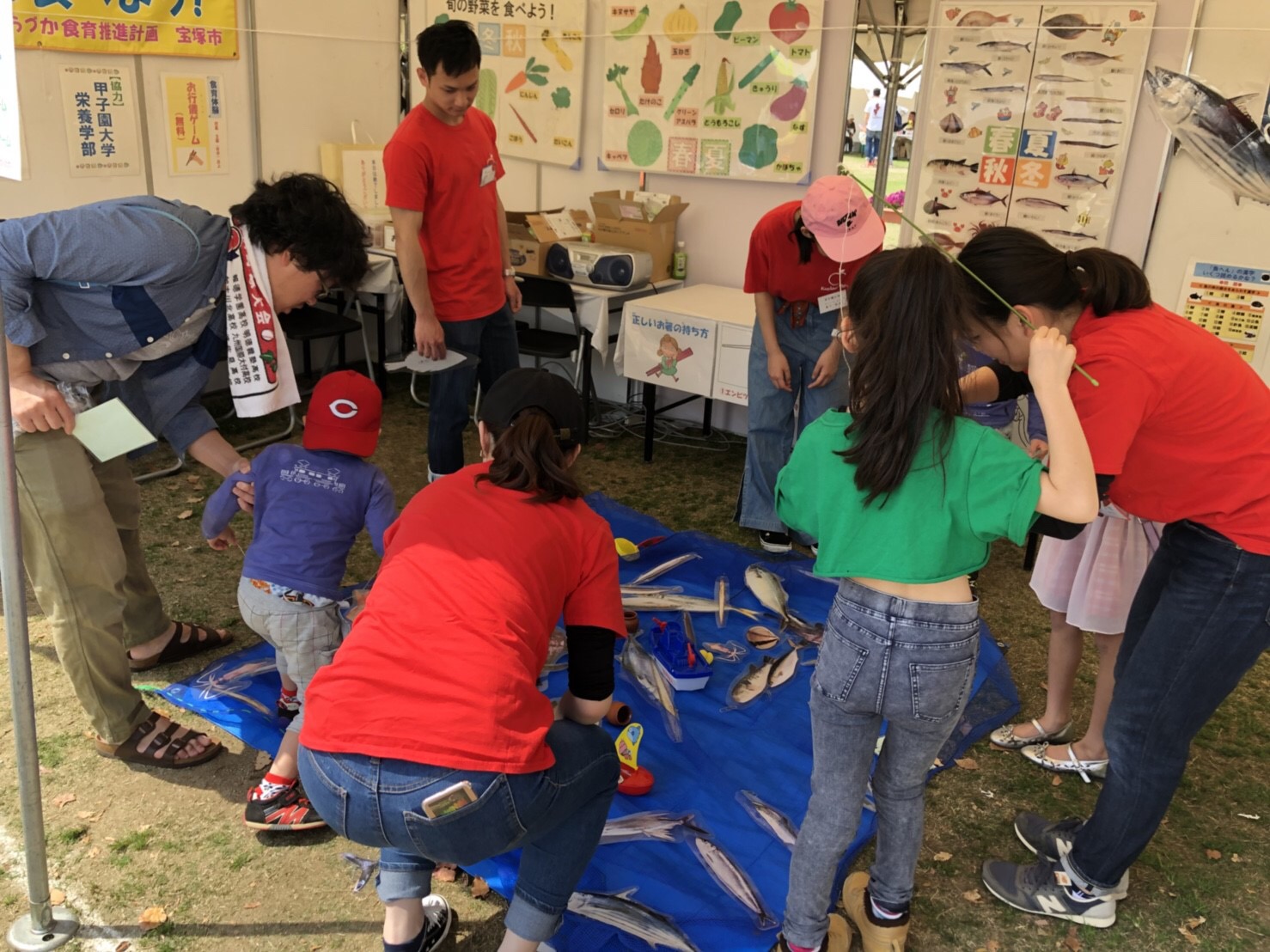 4月21日、22日、宝塚市の末広中央公園で開催した「第26回花と緑のフェスティバル」に本学学生9名(栄養学科4回生)が参加しました。宝塚市が「たからづか食育推進計画」の啓発活動の一環として出店したPRブースの中の食育ゲームを手伝いました。ブルーシートを海に見立て、宝塚市の栄養士が作った魚をつり上げる「魚つりゲーム」では、子どもたちは楽しそうに、魚の名前や旬などを学んでいました。また、「お行儀ゲーム」では、学生が箸の正しい持ち方をレクチャーした後、大豆をいくつつまめるかのゲームを行いました。子どもたちに交じって、一生懸命大豆をつまむ大人の姿も見かけられました。