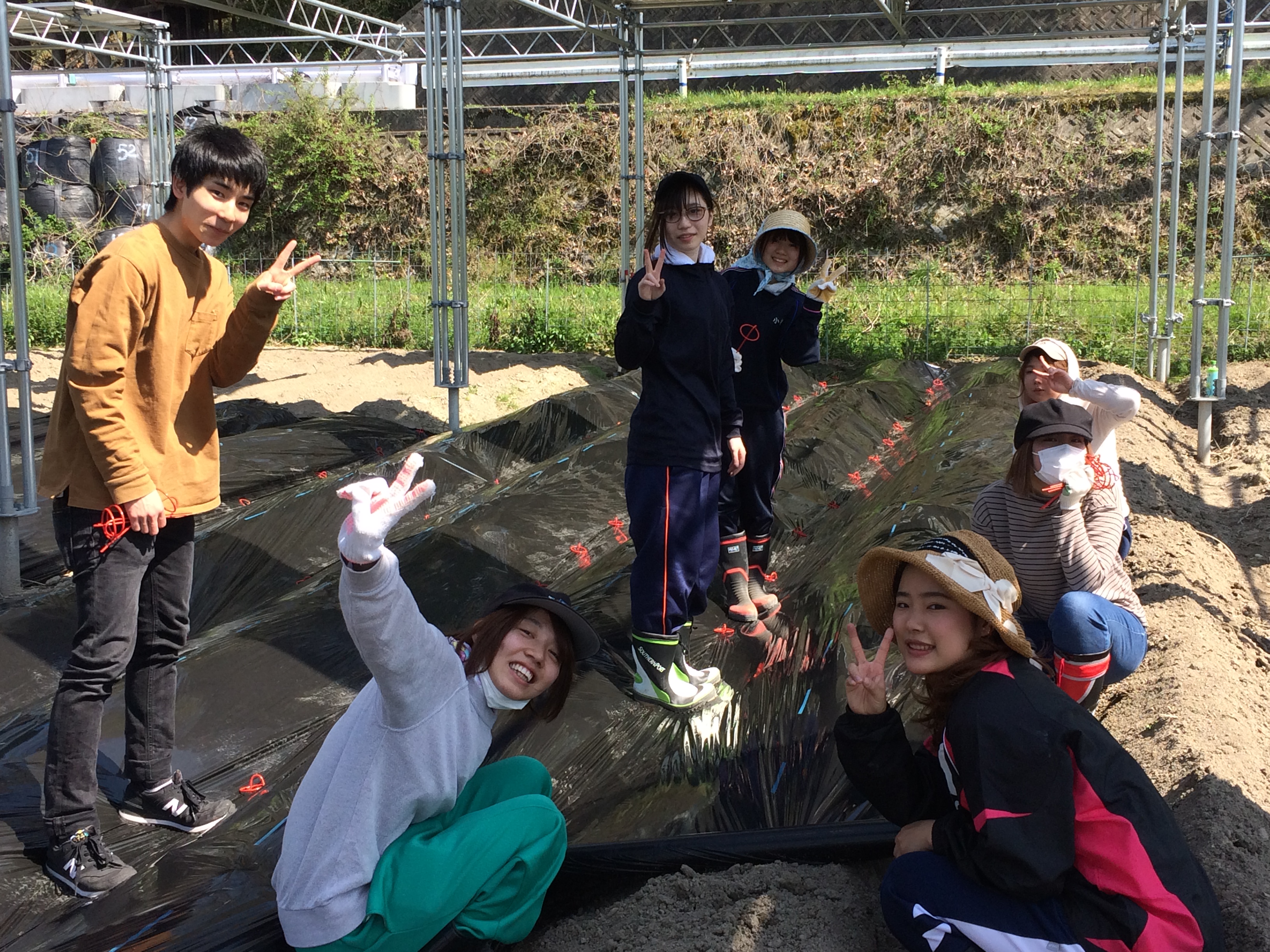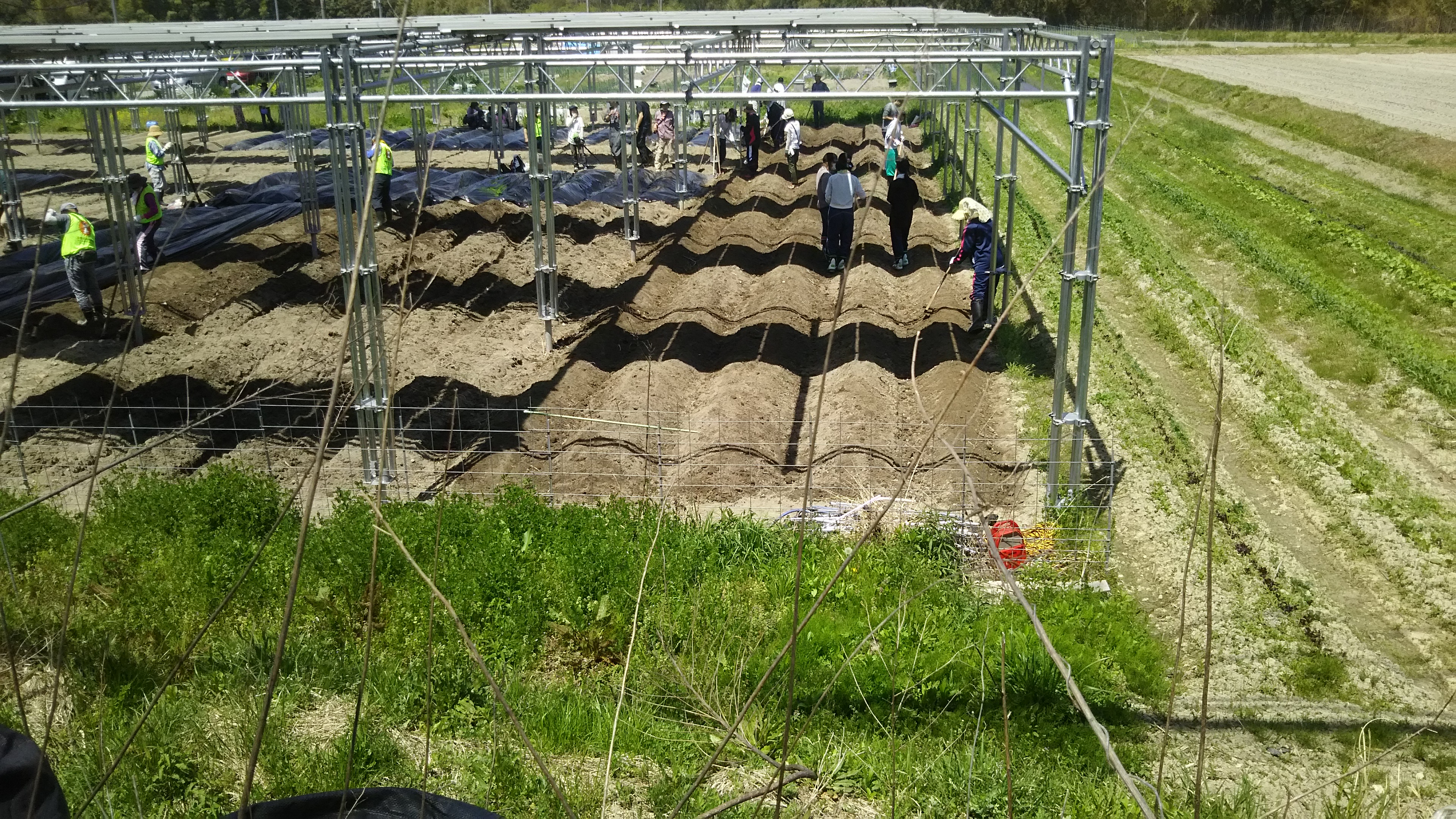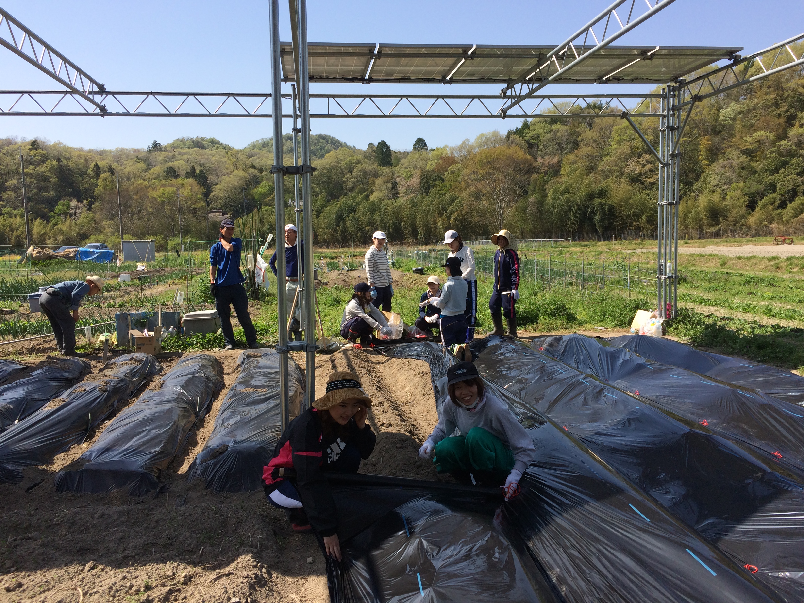 学生はほとんど農業経験がありませんが、西谷ソーラーシェアリング協会の古家義高さん、柴田邦雄さんの指導のもと、鍬を担ぎ、長靴、作業着、手袋、帽子に身を固め、ソーラーパネル1号基が設置してある農地に畝を作りました。午前10時からの作業でしたが、思ったよりも土が固く、鍬が入りません。溝が曲がります。昼過ぎまで長い畝を整地し、たっぷりと土を味わいました。午後からは、雑草防止のマルチ張りでした。マルチシートは風に煽られ、皆が協力しないと効率よく作業できません。苦労の連続でしたが、ソーラーパネルが昼の強い日差しを一部遮ってくれました。今後、苗植え、水やり、収穫を経験します。