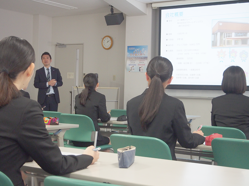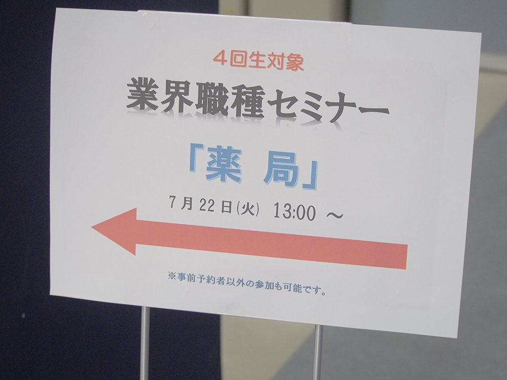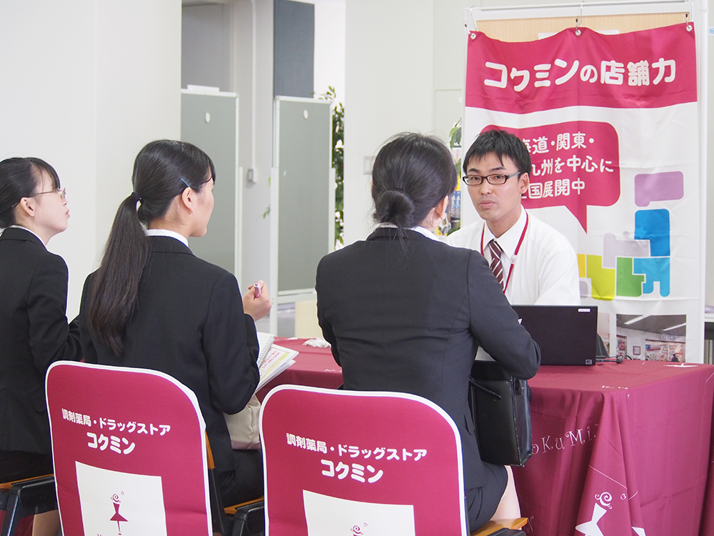 参加企業は、コクミン、阪神調剤薬局、ゆう薬局グループ、ストーン・フィールドの4社。個別相談会もあり、学生は薬局業界の話に熱心に耳を傾けていました。