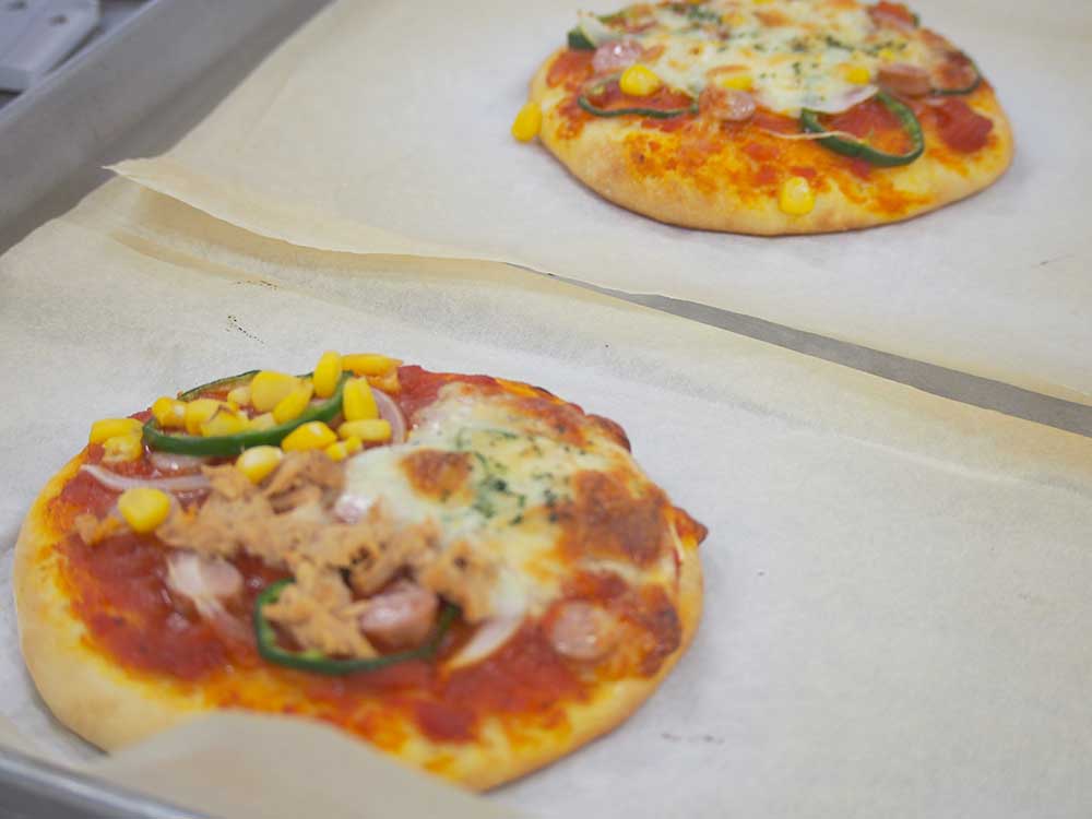栄養学部は『食品開発の世界をのぞいてみよう!』ということで、地元企業と共同開発したヨーグルトの試食や、地元野菜を使ったオリジナルPizza作りを体験していただきました。