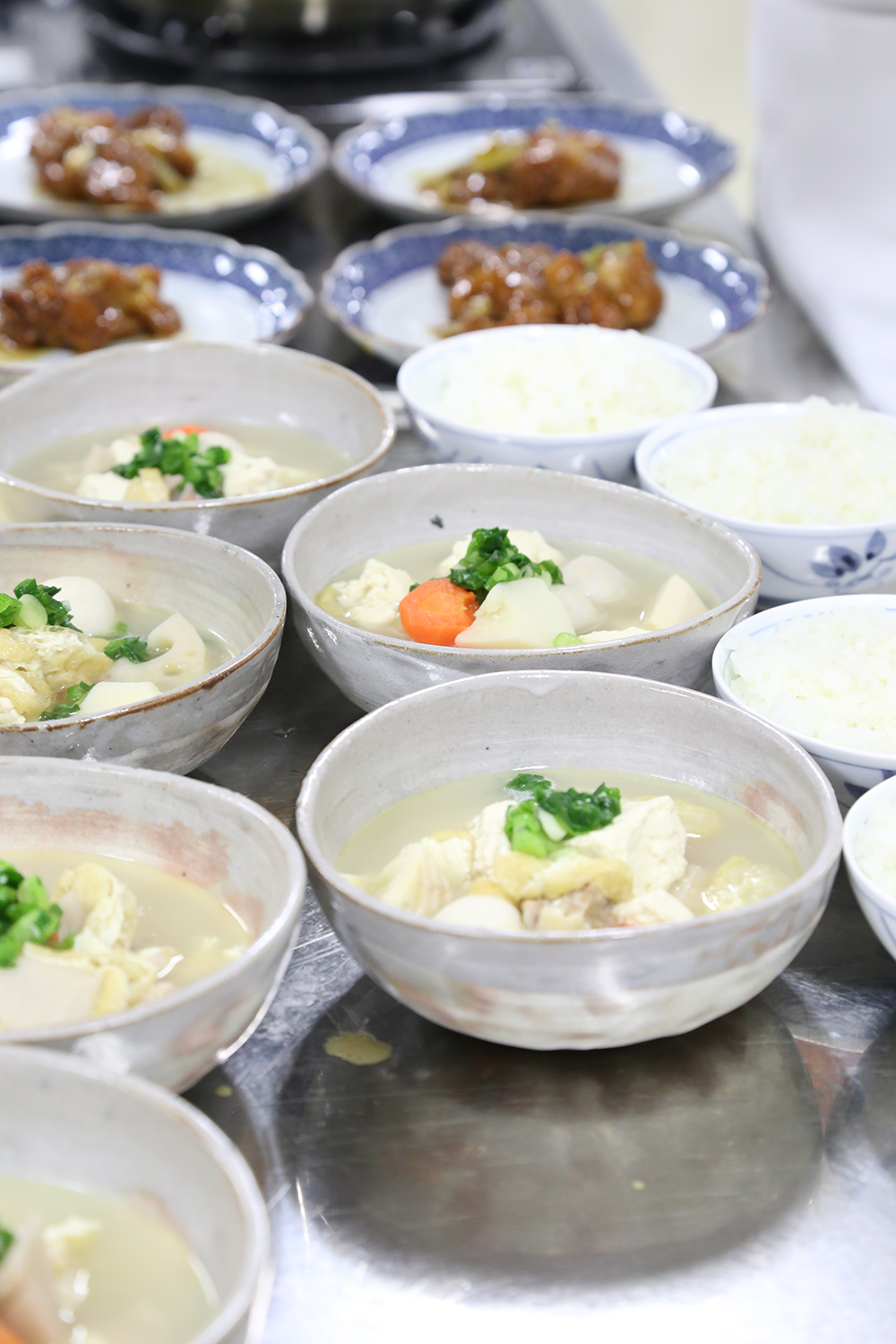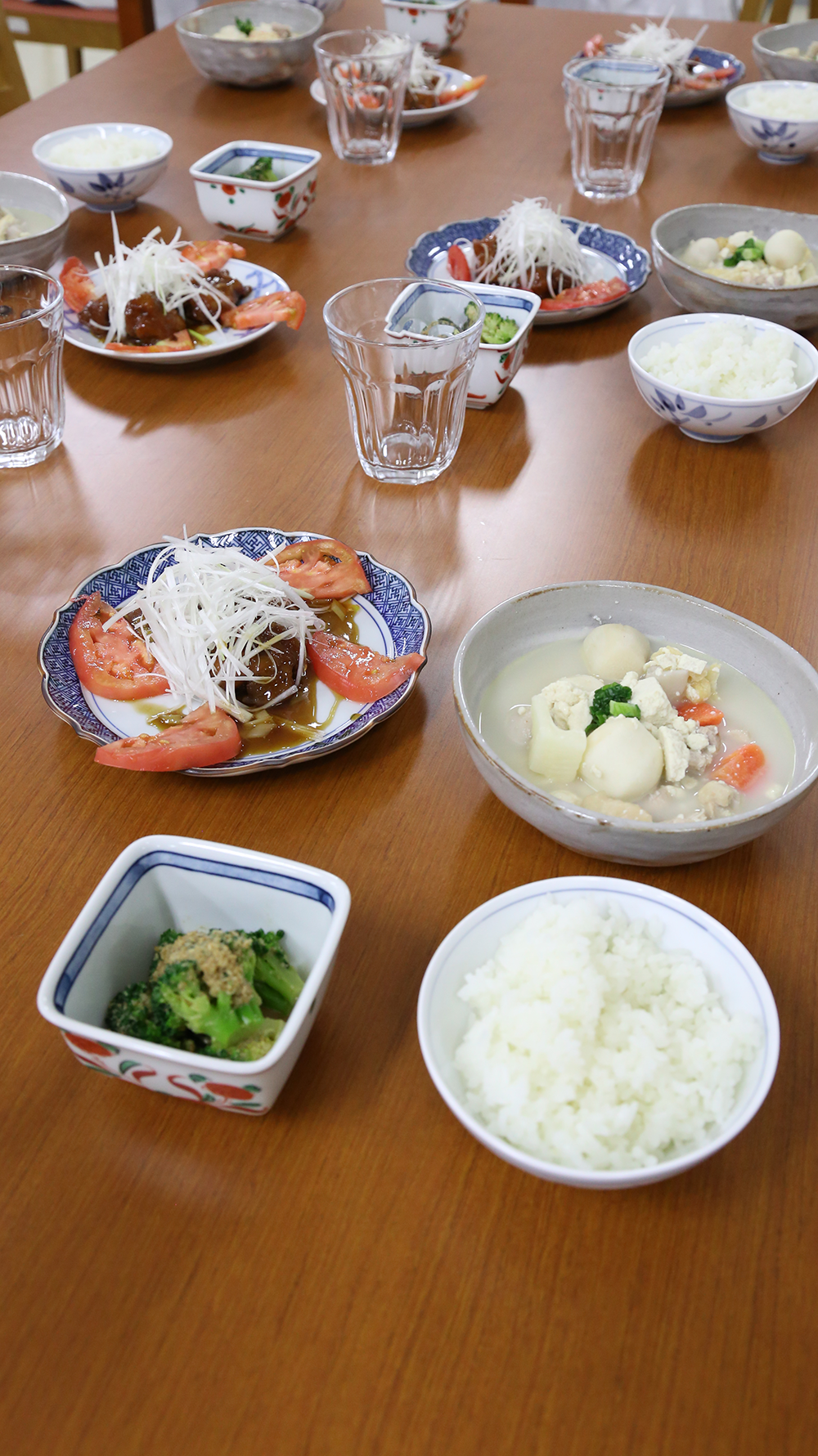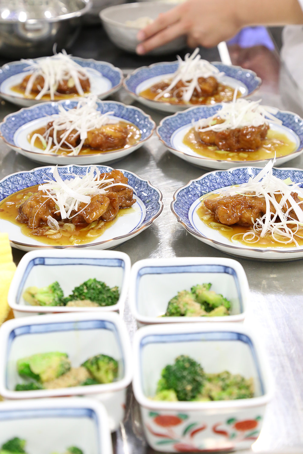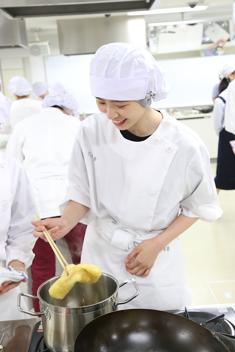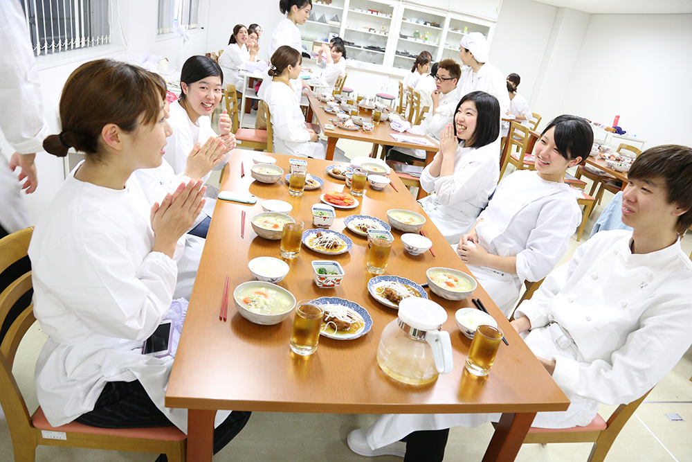 受講した学生は、冷凍食品の栄養について学び「冷凍食品のイメージが変わった!」という感想も聞かれました。また、大学入学後初めての調理実習だったため、事前に食品衛生と手洗いについて学び、調理着の準備も整えて臨みました。実習では、「鶏のから揚げ甘酢あんかけ」「ブロッコリーのごま和え」「根菜のけんちん汁」を作り、調理後は白飯とともに楽しくいただきました。