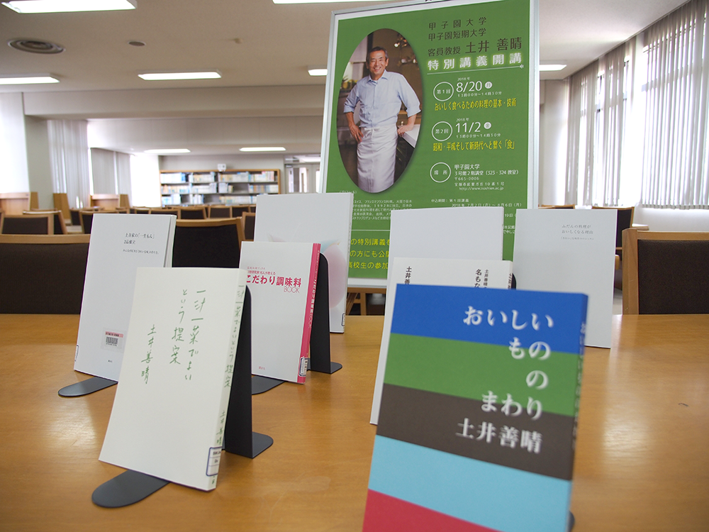 今年度から本学と甲子園短期大学との客員教授に就任した土井善晴氏の著作コーナーが図書館に新設されました。土井客員教授の「一汁一菜でよいという提案」など計9冊が並んでいます。図書館は一般の方も入館可能です。
