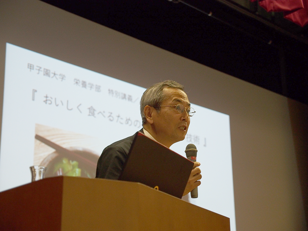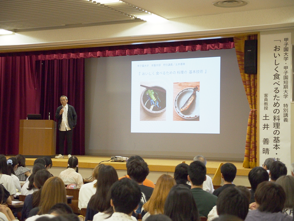 甲子園大学と甲子園短期大学の客員教授に就任した土井善晴先生の特別講義が8月20日、本学の講堂で行われました。今回のテーマは、「おいしく食べるための料理の基本・技術」。おいしい料理は、調理の技術の高さより、手や身だしなみを清潔に保ったり、細やかな神経を働かせたりする日本のけじめの文化が基本にあると指摘されました。本学と短大の学生のほか、100人を超える一般聴講者は、土井客員教授の名講義に聴き入っていました。