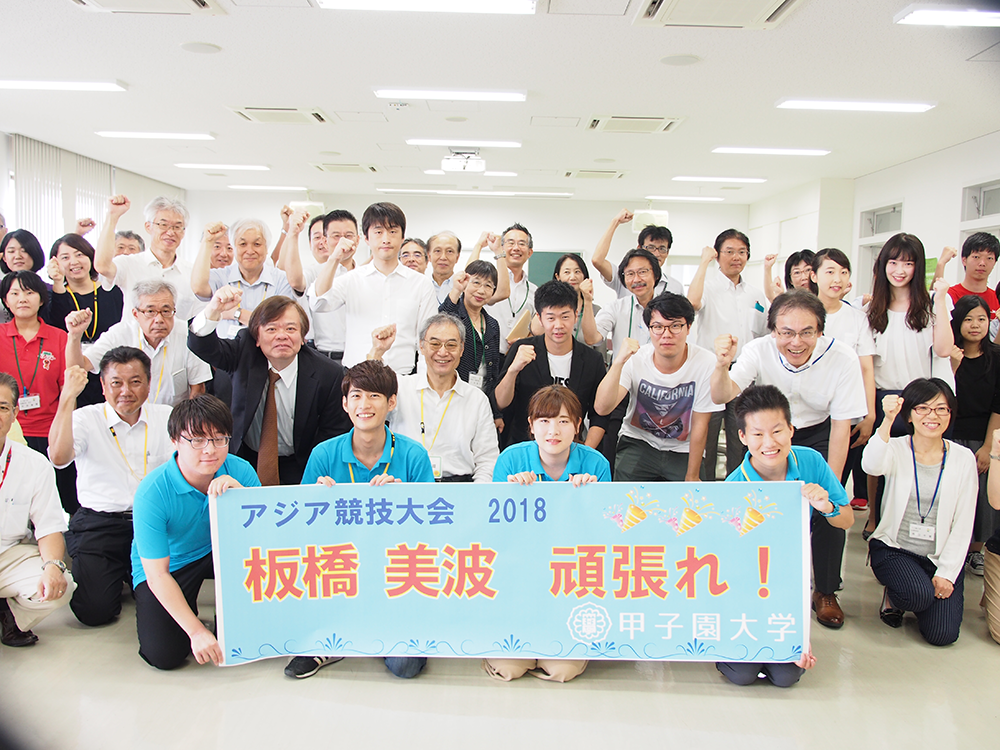 お知らせ2018.08.25 アジア大会出場の板橋美波さんを応援しています! 現在、インドネシアで開催中の第18回アジア競技大会に、日本代表の一人として心理学部1回生の板橋美波さん(JSS宝塚)が出場します。板橋さんは、2016年のリオデジャネイロ五輪の女子高飛び込みで日本勢として80年ぶりに8位入賞を果たした飛び込み界のエースです。今回、教職員と学生が集まり、日本からエールを送りました。飛び込みの日程は、8月28日から。 みなさんも板橋さんを応援しましょう! 発信部署:事務局 « 前の記事へ 次の記事へ »