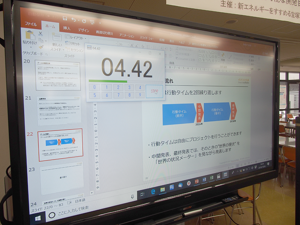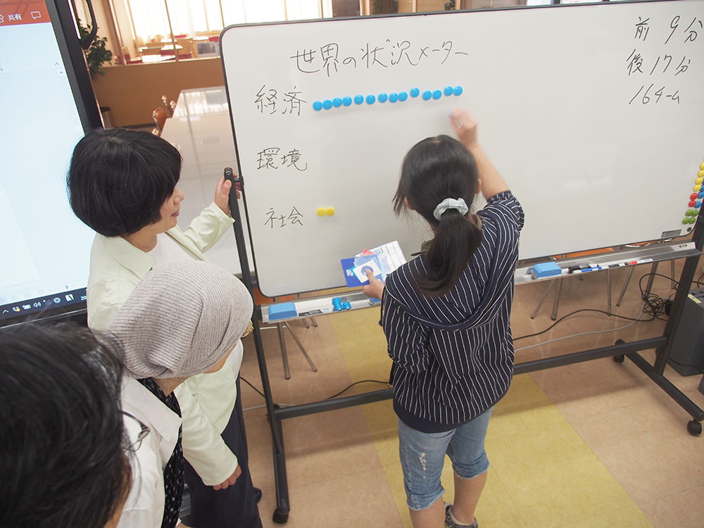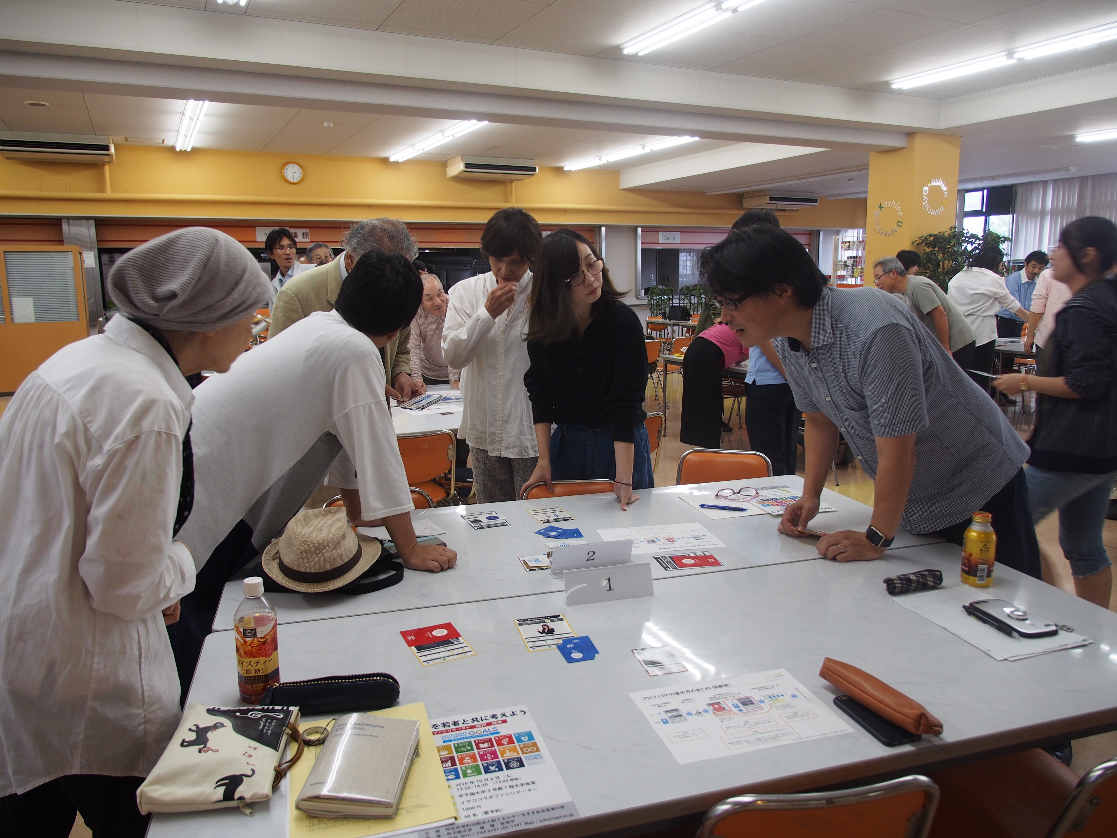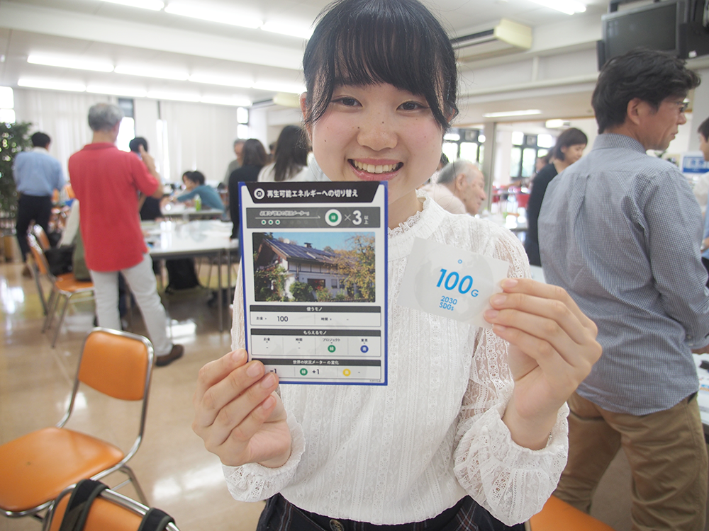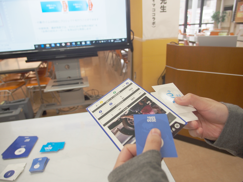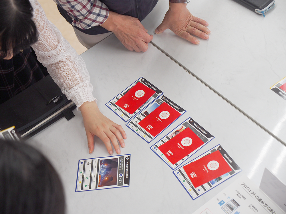 当日はSDGsを広めることを業務とした専門家を招き、SDGsの考え方、プロジェクトの進め方、社会、環境、経済との関連性、プロジェクト推進のためのコミュニケーションなどを、同専門家が開発したカードを用いて体感しました。栄養学部フードデザイン学科の学生13名、教員1名、一般の方13名、NPO団体12名、行政から4名、企業と生協から各1名の参加でした。カードゲームと同じ要領で、プロジェクトを推進させ、その結果が社会、環境、経済にどのように関連し、国連があげた17の課題が解決されてゆくのかを楽しく体験しました。カードゲームという取り掛かりやすいものであるにもかかわらず、プロジェクトの達成感、社会など外的要因への影響、人間心理などに対し、「気づき」と「内省」と「希望」を感じさせるイベントになりました。
