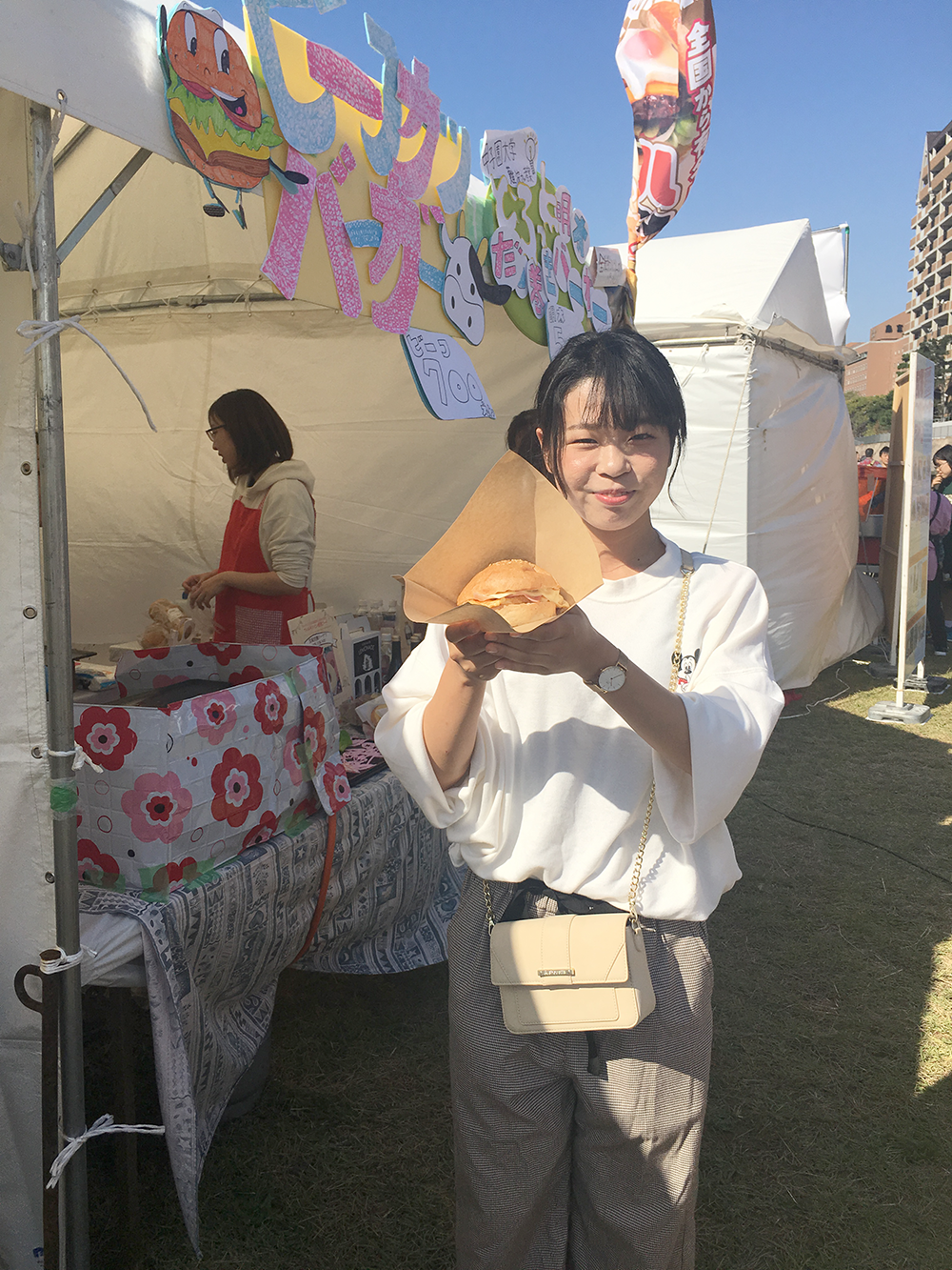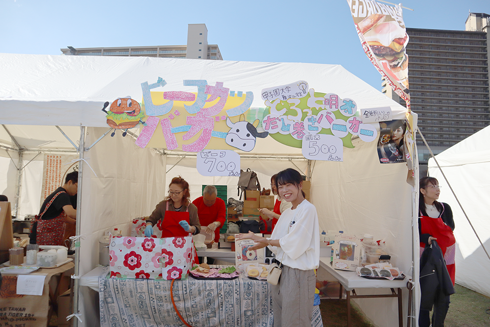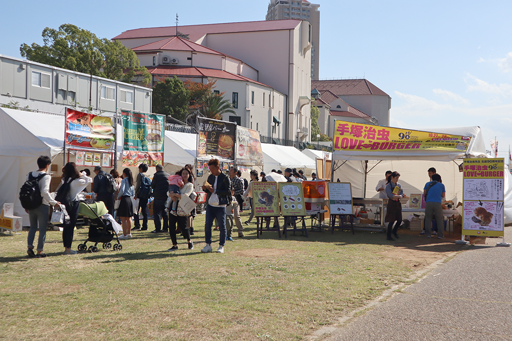 10月27日、28日に武庫川河川敷で「宝塚ファミリーバーガーランド2018」(一般社団法人西日本ハンバーガー協会主催)が開かれ、本学栄養学部栄養学科3回生の難波美菜さんが考案した「とろっとだし巻きバーガー」が販売されました。このハンバーガフェスタには、素材や製法にこだわるワンランク上の「グルメバーガー」や、土地の名産をハンバーガーに盛り込んだ「ご当地バーガー」などが集結し、大盛況に終わりました。
