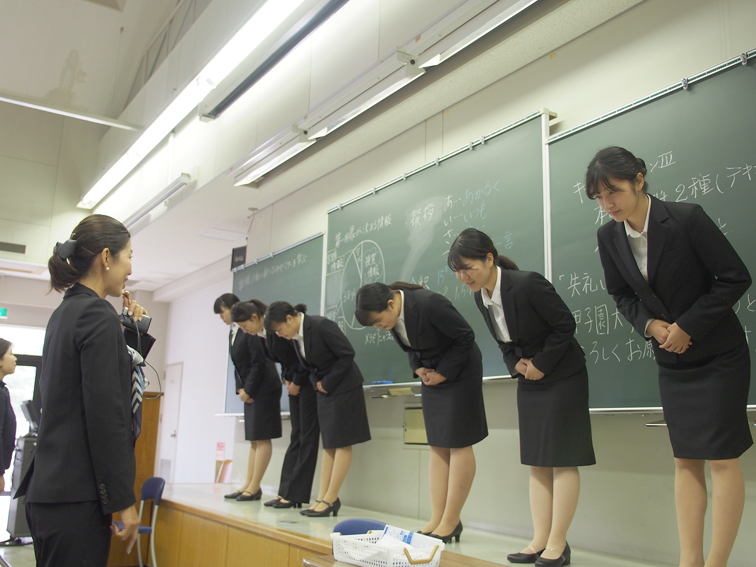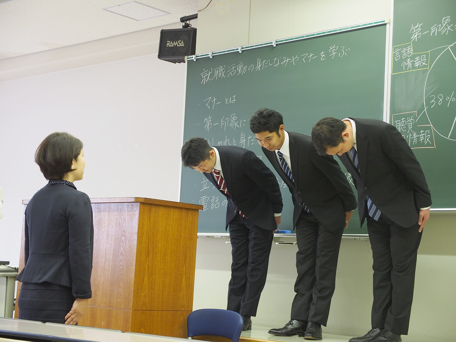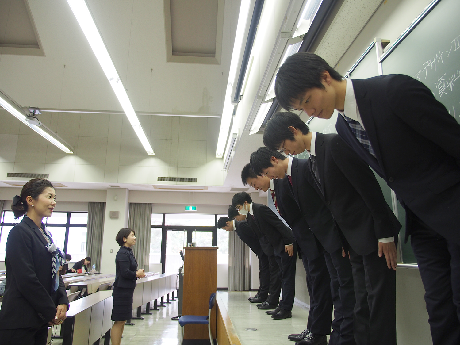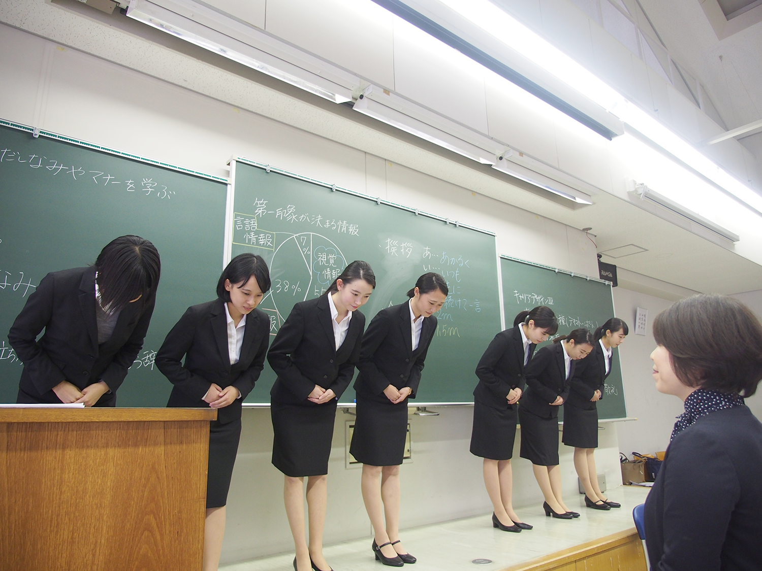 前半の講義から、後半では身だしなみ、会釈や挨拶の仕方など講師の先生から学生全員が直接指導を受けました。学生は真剣そのものでしたが、貴重で有意義な体験となったはずです。授業が終わる頃には、自然に美しい姿勢で立っている姿が見られました。