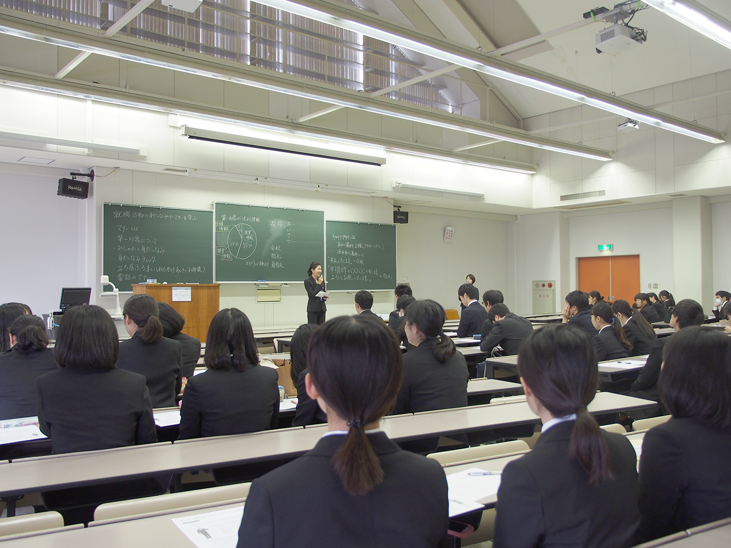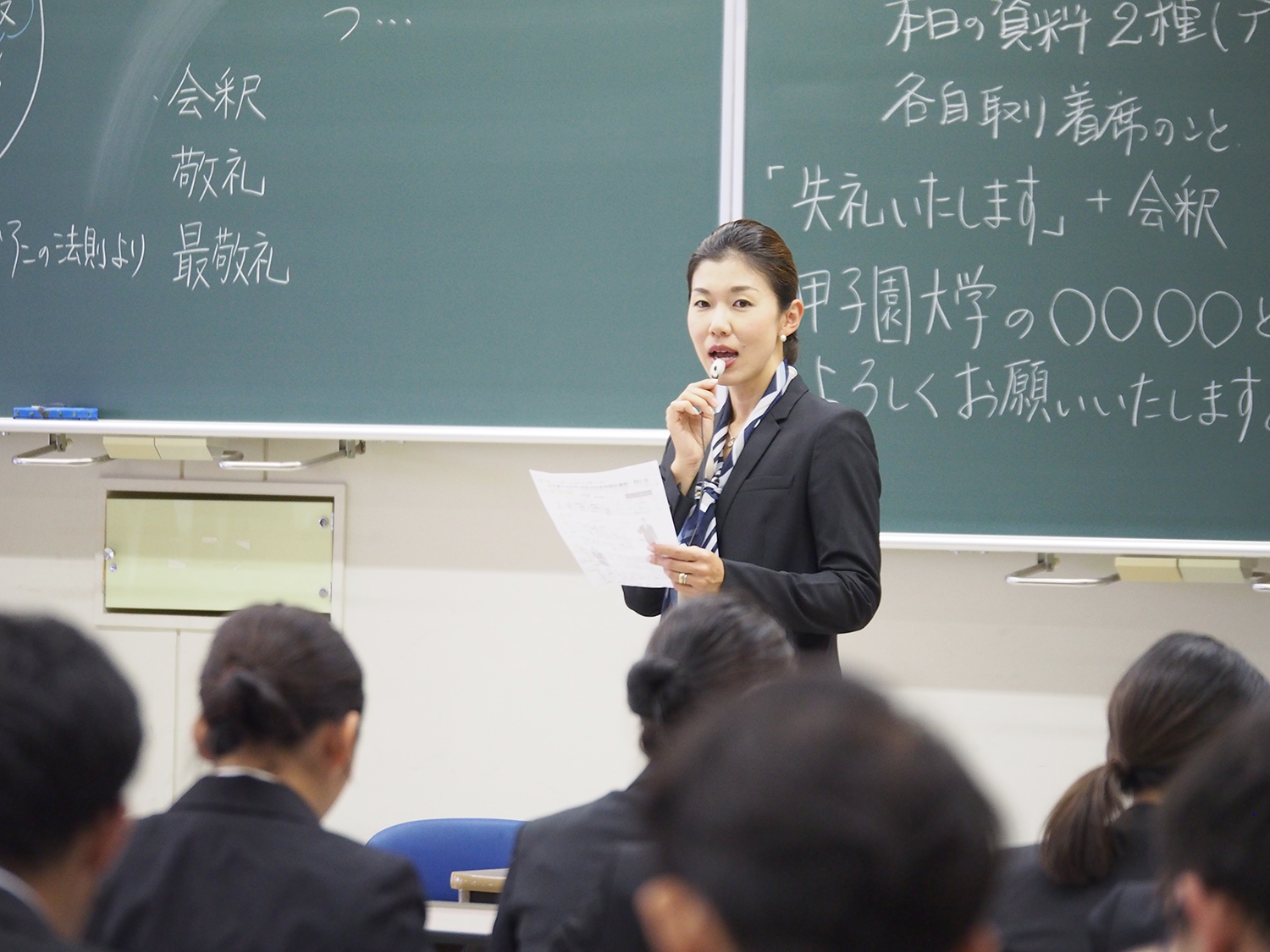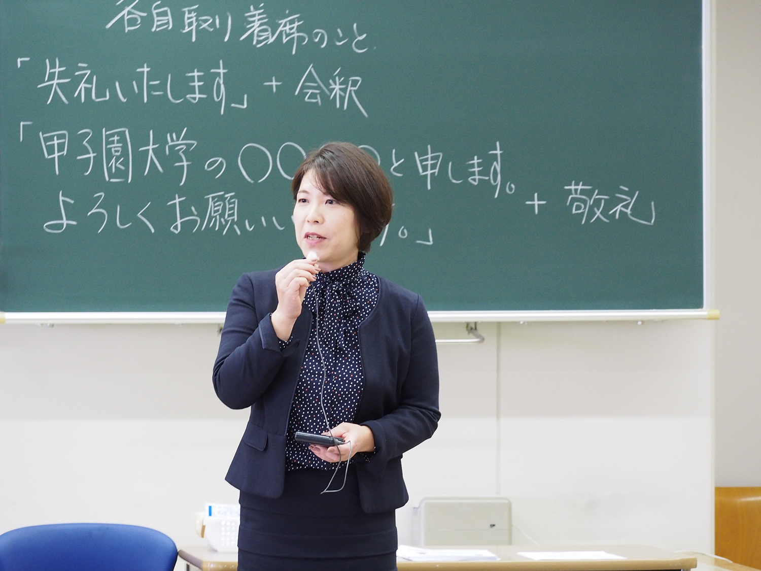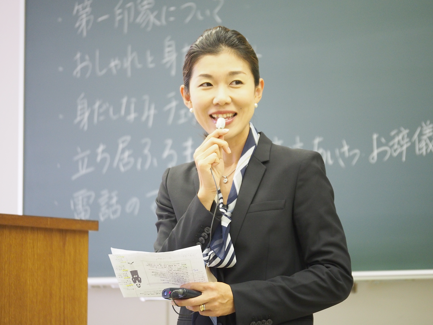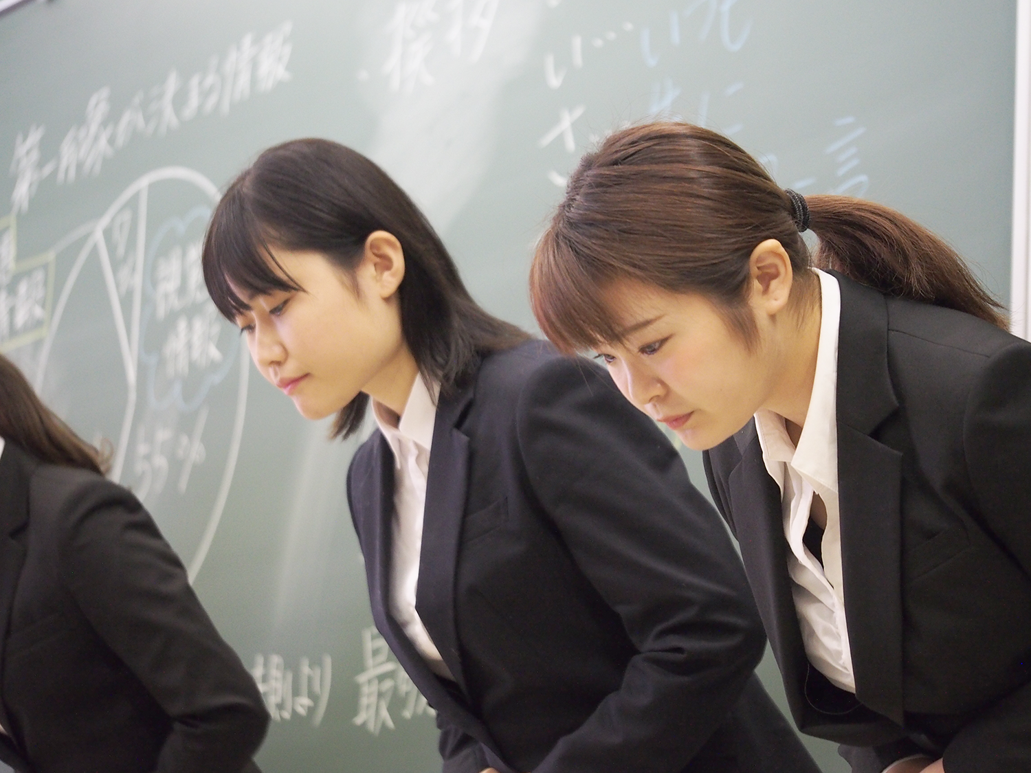 前半の講義から、後半では身だしなみ、会釈や挨拶の仕方など講師の先生から学生全員が直接指導を受けました。学生は真剣そのものでしたが、貴重で有意義な体験となったはずです。授業が終わる頃には、自然に美しい姿勢で立っている姿が見られました。