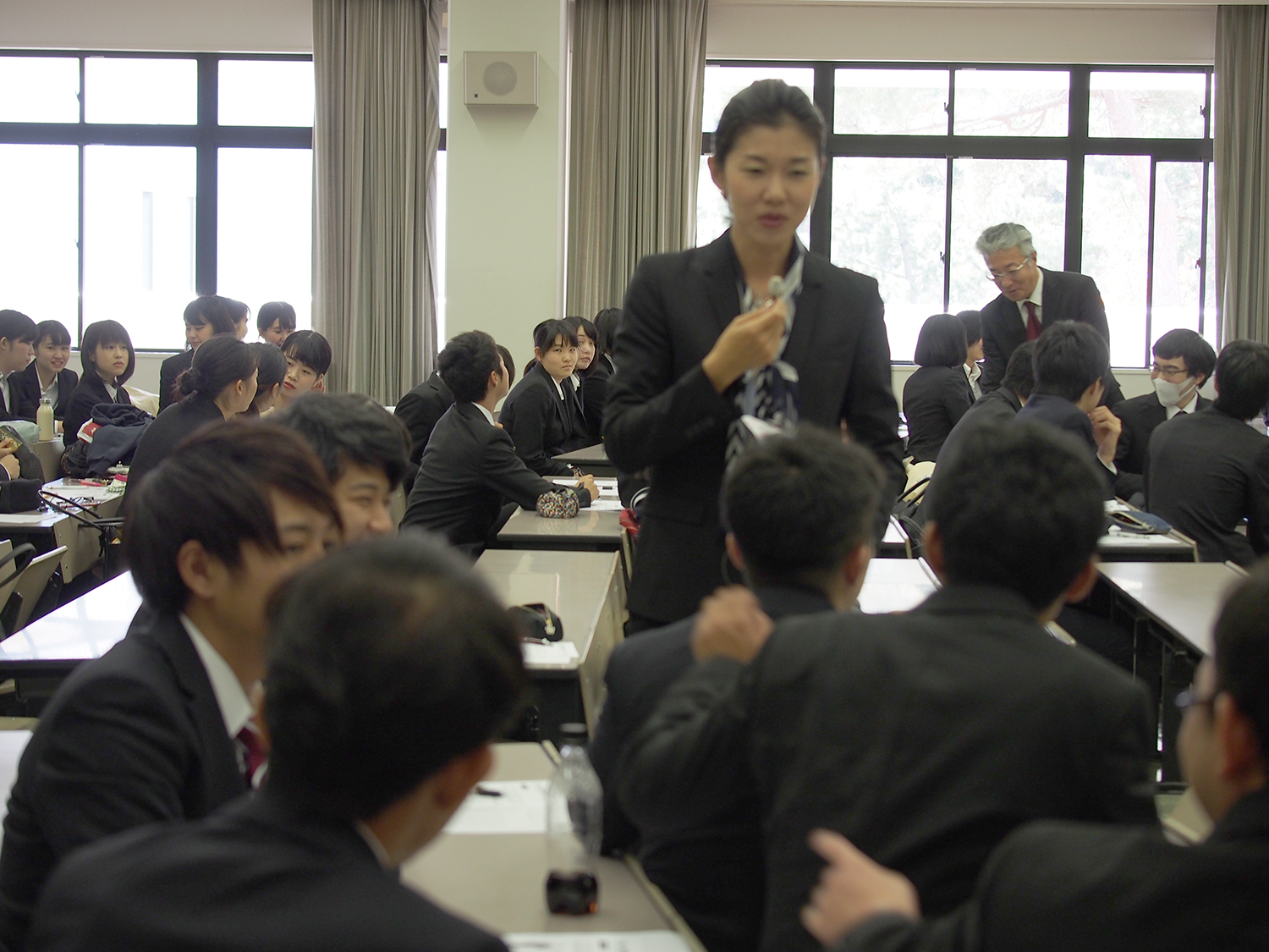 11月7日、「キャリアデザインⅢ」の授業で、元日本航空国際線のキャビンアテンダントの講師2名をお招きし、就活に向けたマナーレッスンが行われました。前週のグループディスカッションに続き、実践型授業でした。今回は接客のプロフェッショナルから、90分間みっちりと、立ち居振る舞いの基本から、表情の作り方、美しい立ち方など様々な角度から学びました。