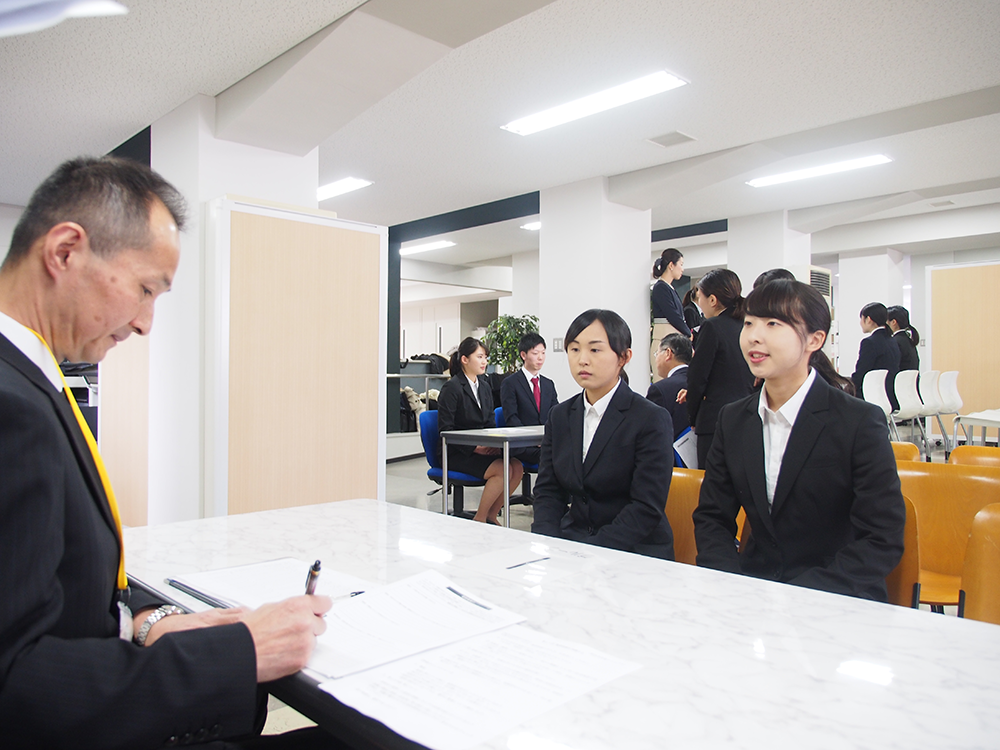 11月7日のマナーレッスンに続き、21日の「キャリアデザインⅢ」の授業では、栄養学部、心理学部の教員と事務職員が面接官役に扮し、実践さながらの面接特訓を行いました。学生は面接官役からの質問に対して受け答えするだけでなく、マナーレッスンで習った「立ち居振る舞い」「表情の作り方」「姿勢」なども常に意識しなければならず、みな真剣そのものでした。
