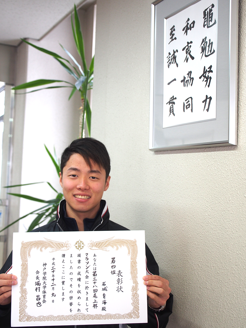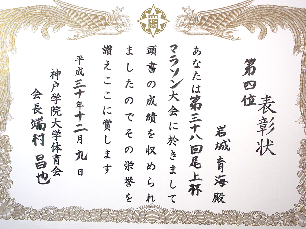 WHAT'S NEW2018.12.11 栄養学部3回生の岩城育海さんが「4大学マラソン」で大健闘! 栄養学部栄養学科3回生の岩城育海さん(陸上部キャプテン)が12月9日、神戸ポートアイランドで開催された「4大学マラソン大会(第38回尾上杯マラソン大会)」に出場し、4位の成績を収めました。惜しくも上位入賞は果たせませんでしたが、今回の経験を生かして12月23日の宝塚マラソンに出場する予定。さらなる健闘を祈ります! 発信部署:事務局