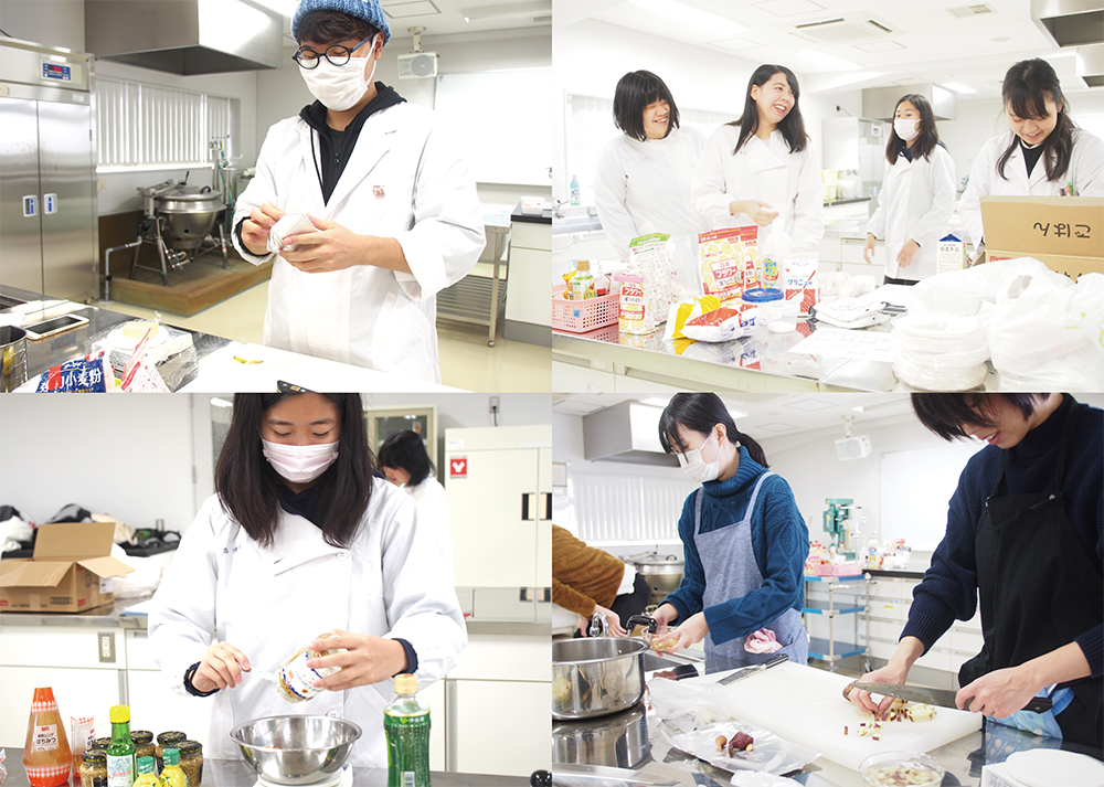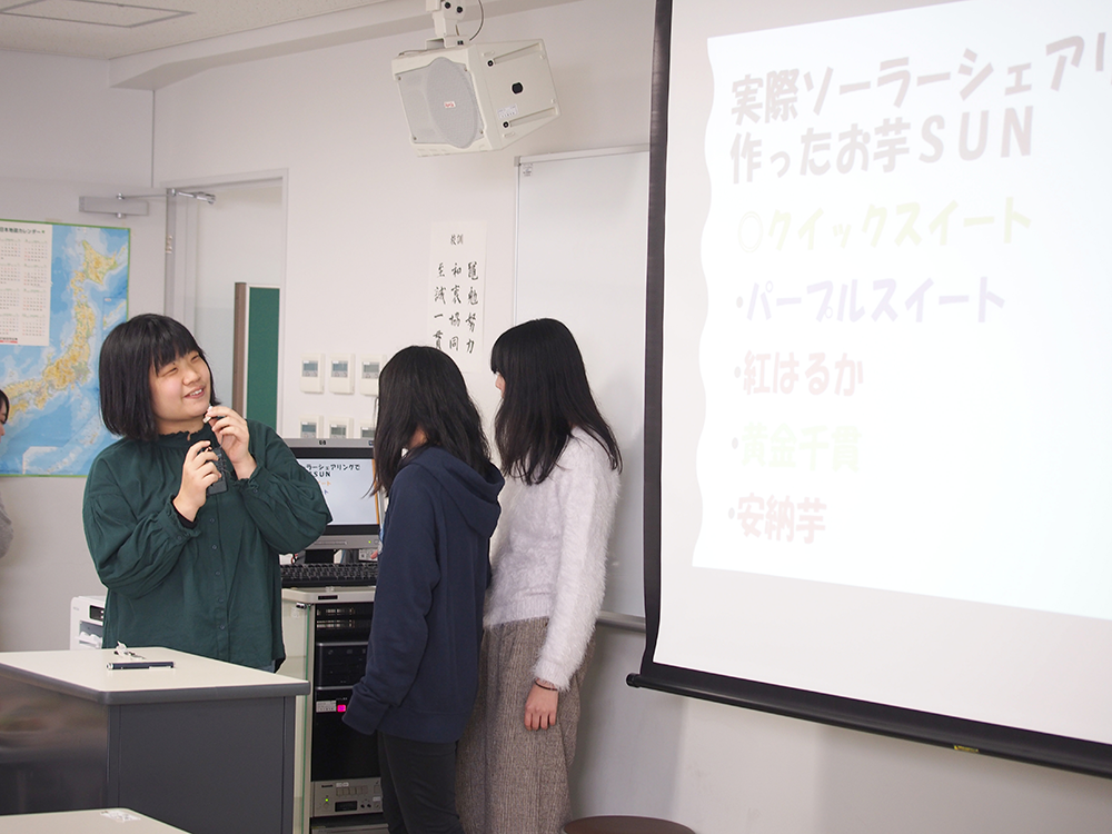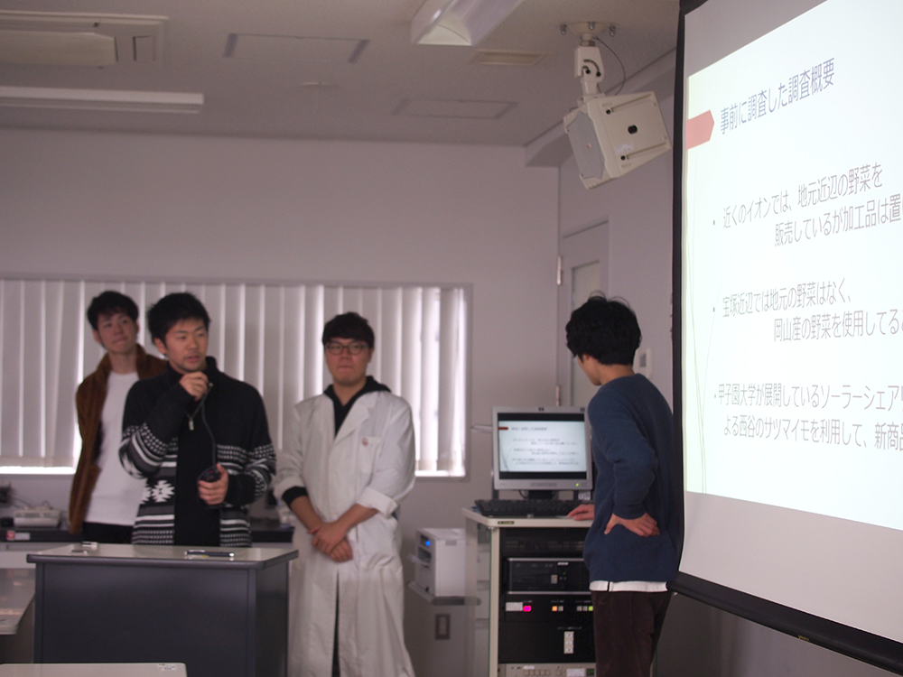 12月12日、栄養学部フードデザイン学科が展開しているソーラーシェアリングの下で栽培したサツマイモを用いての、新レシピ開発の発表会を開催しました。食と地域の実践演習を履修している学生9グループ23名が、「農とエネルギー(環境)と食」「6次産業化」に関する発表を行いました。本学が得意とする新レシピ開発力を動員し、宝塚・西谷地域を活性化することを目指しての発表です。西谷ソーラーシェアリング協会、宝塚商工会議所、宝塚すみれ発電株式会社、コープこうべ生活協同組合、NPO法人新エネルギーを考える宝塚の会の方々、さらに本学教職員を招いて新レシピの試食をしました。学生は、「おいもSUNSUNシュトーレン」「いもDEピザ」などのユニークなレシピを発表。企業の方からの鋭い指摘などもあり、楽しく有意義な発表会となりました。