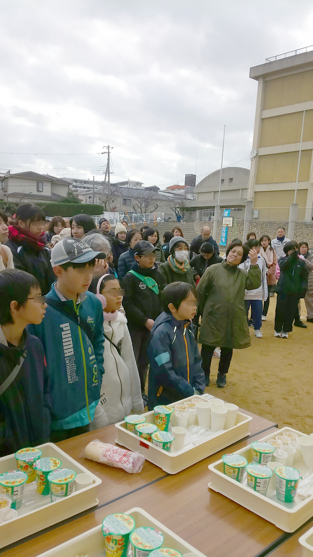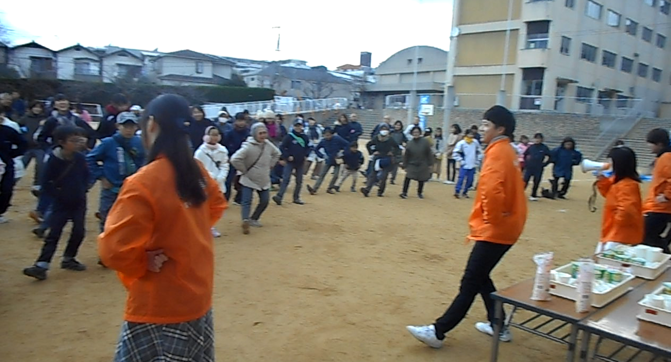 栄養学部栄養学科の野間智子准教授とボランティアサークルトリプルハートメンバー、有志学生など計14人が、12月15日、宝塚第一小学校に集まり、第10回宝塚第一小学校区防災訓練に参加しました。「車椅子の押し方」「AED使用法」「応急措置」「煙体験」「放水訓練」などみんなで楽しく体験しました。