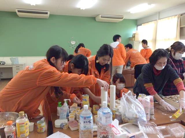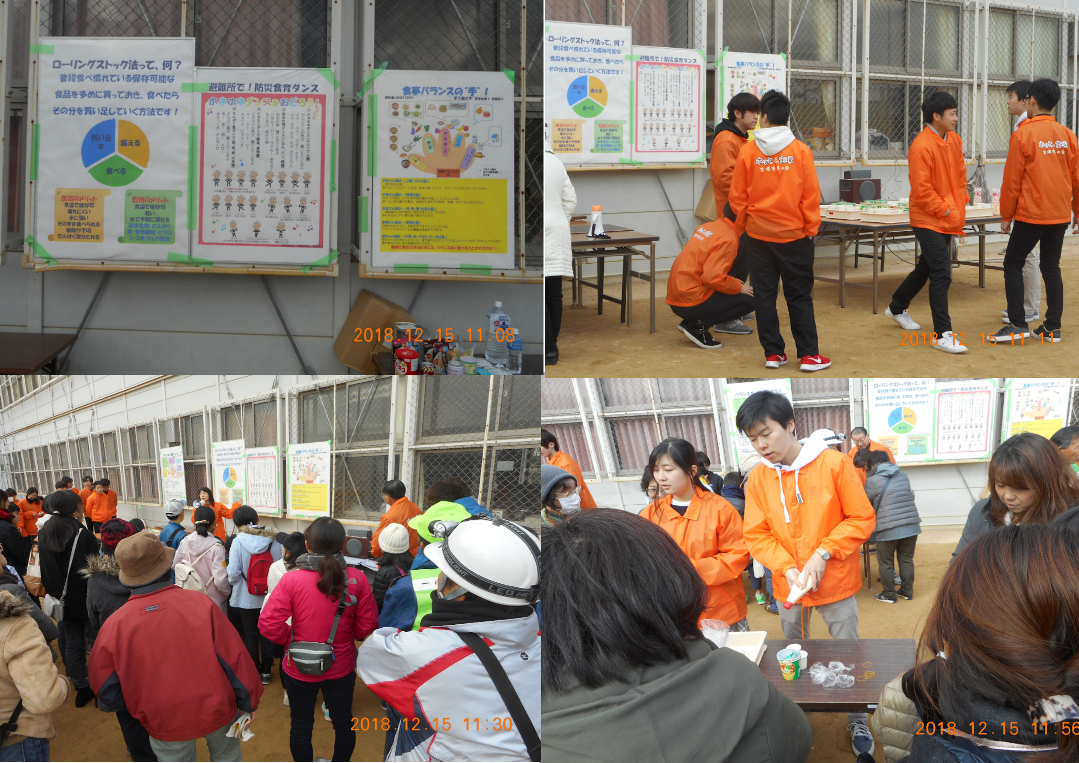 野間准教授の指導のもと、エコノミークラス症候群防止のための体操「ホネホネ!ダンス!」を来場者全員でダンス。これに続いて、栄養確保のための「非常食ローリングストック法バランスよい備蓄」の説明がありました。さらに、簡単にできかつバランスもとれるポテトサラダの実践的調理法を伝授し、サークルメンバーのサポートで、来場された150人余りの参加者にふるまわれ大好評でした。