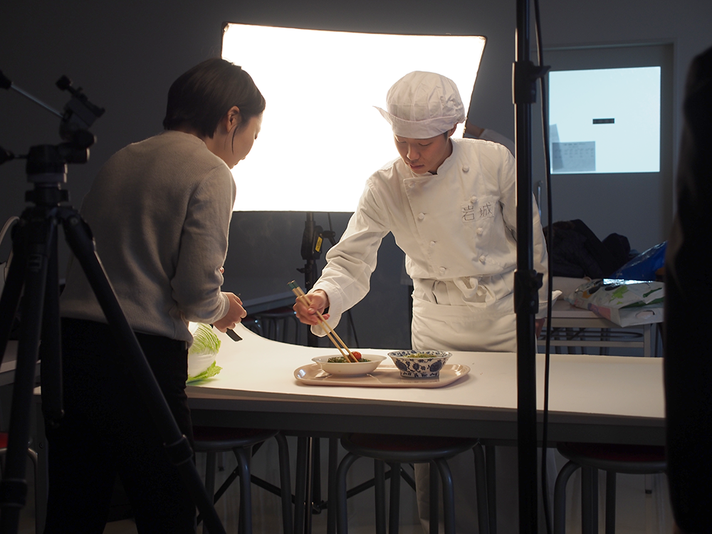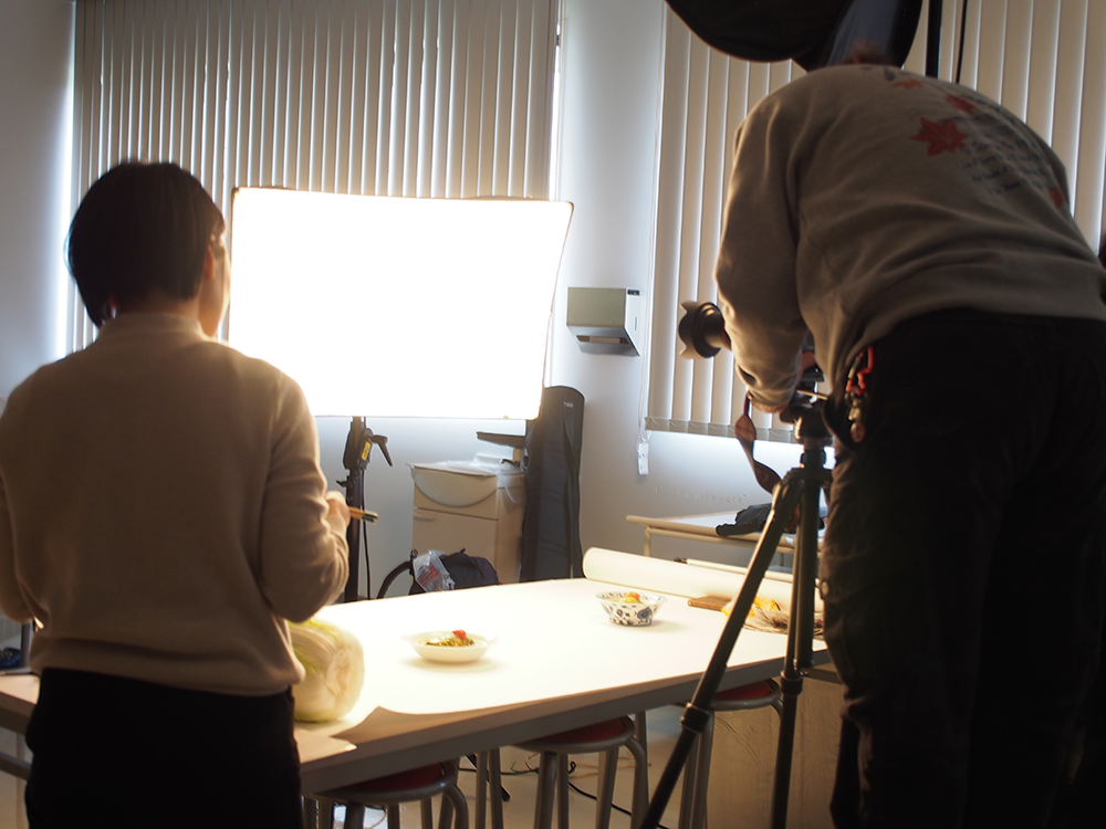 当日は、本格的な機材を持ったカメラマンが、岩城さんの調理した白菜料理のおいしさが立体的に伝わるように、皿の中のにんじんやプチトマトを何度も白菜の上に配置を変えて、撮影されていました。この記事は、来年2月号の県民だよりに掲載予定です。