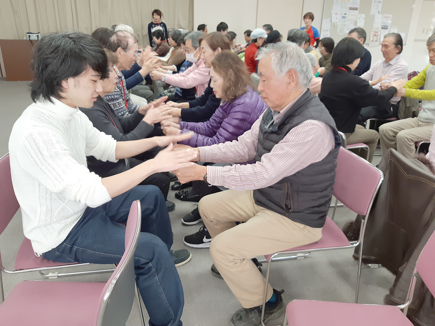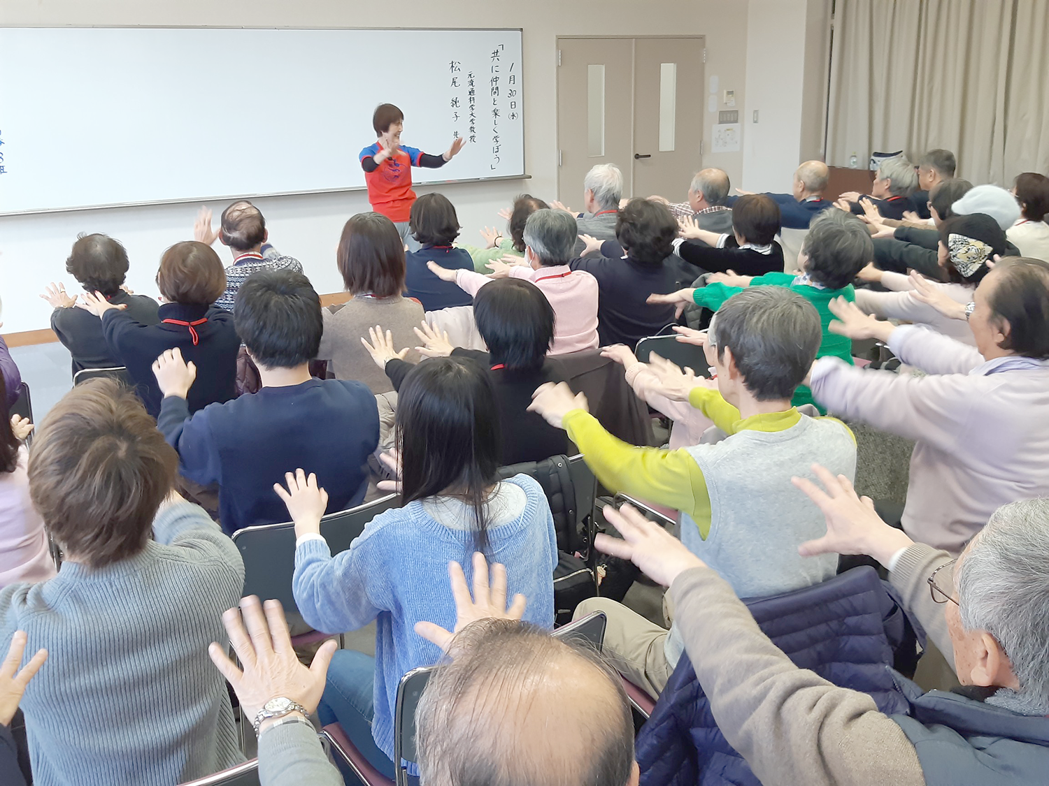 1月30日、阪神シニアカレッジとの交流事業の一環として、本学の学生が同カレッジの講義に参加しました。今回の講師は、松尾純子先生(元流通科学大学教授)です。先生は長年、さまざまな年齢層にダンス指導を行っています。この講座も、実際に身体を動かすエクササイズを中心とした健康増進プログラムでした。