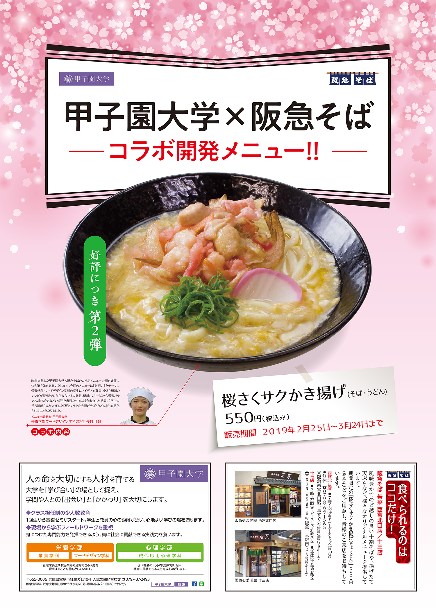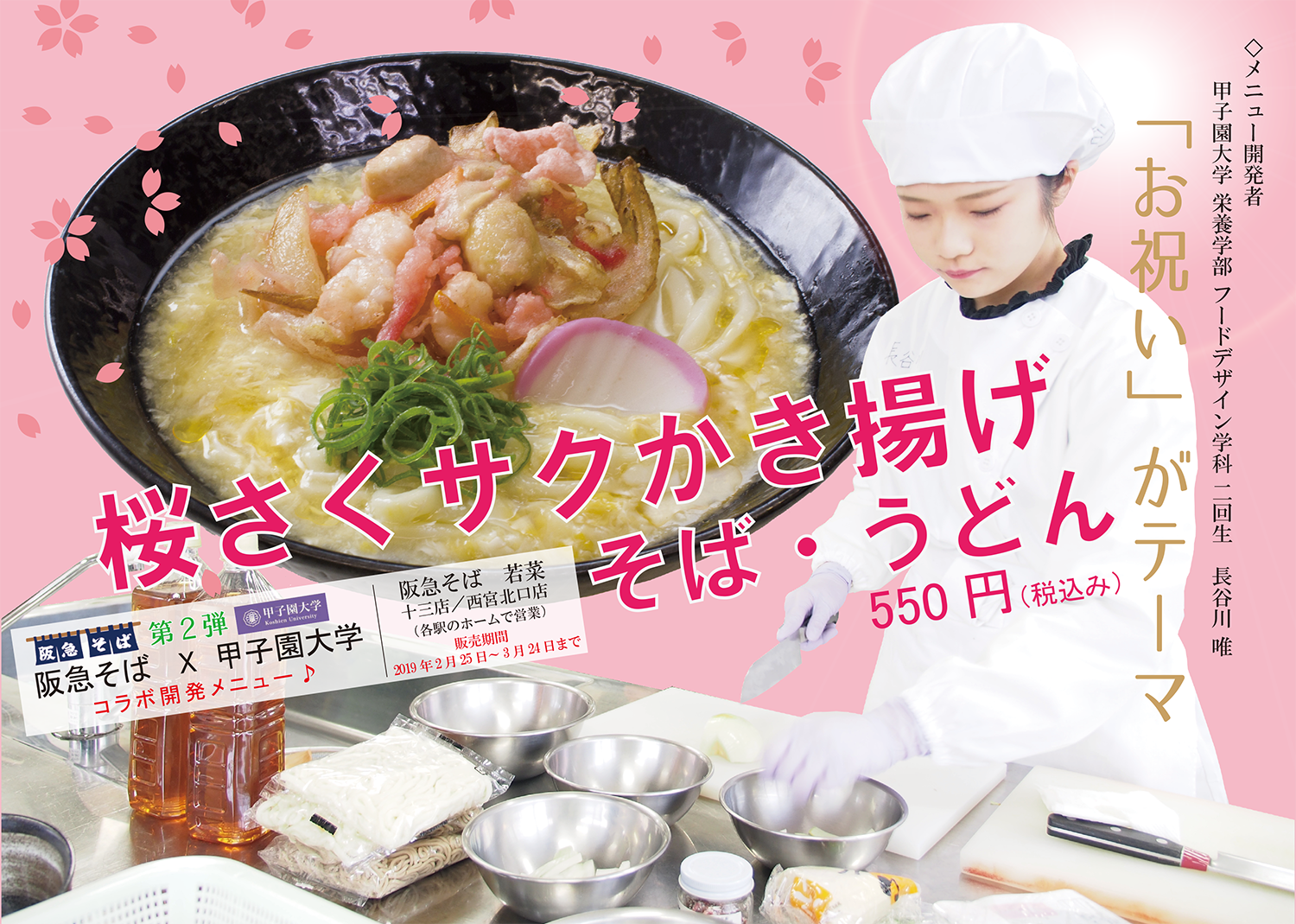 本学と阪急そばとのコラボ企画で、栄養学部フードデザイン学科2回生の長谷川唯さんの考案した「桜さくサクかき揚げそば・うどん」が2月25日から3月24日までの予定で、「阪急そば若菜」西宮北口店と十三店にて販売されます。春を一足先に感じさせる桜色のかき揚げの食感と、海老オイルをアクセントとした風味豊かな玉子あんかけだしが絶妙な味わいを醸し出すメニューです。