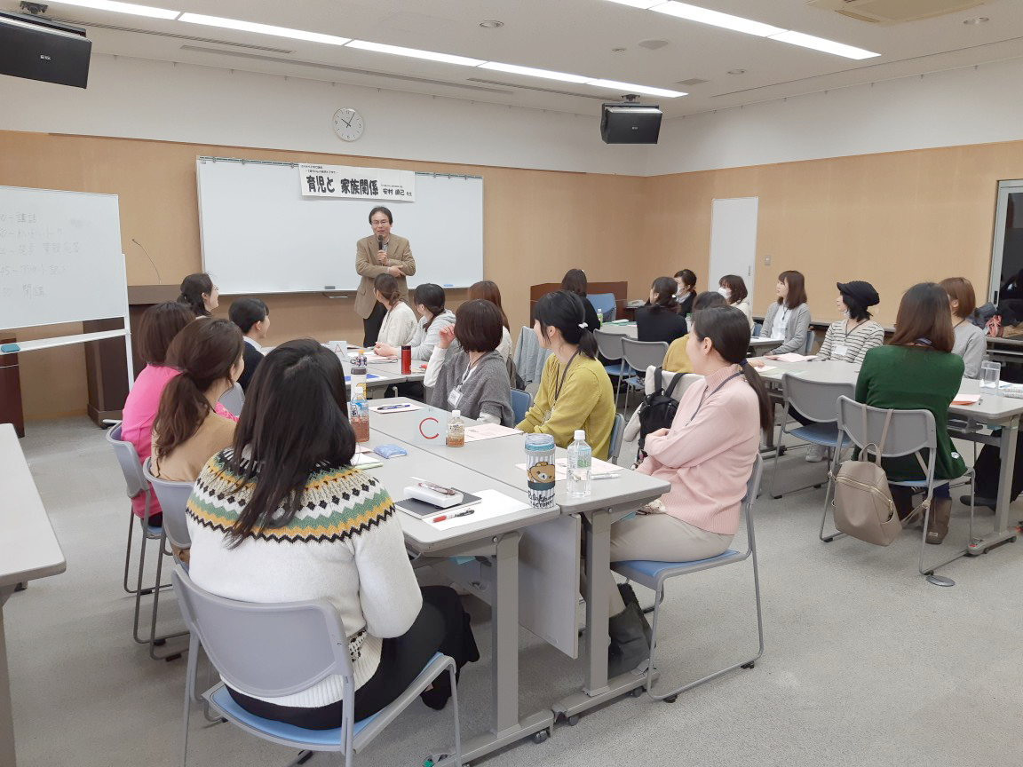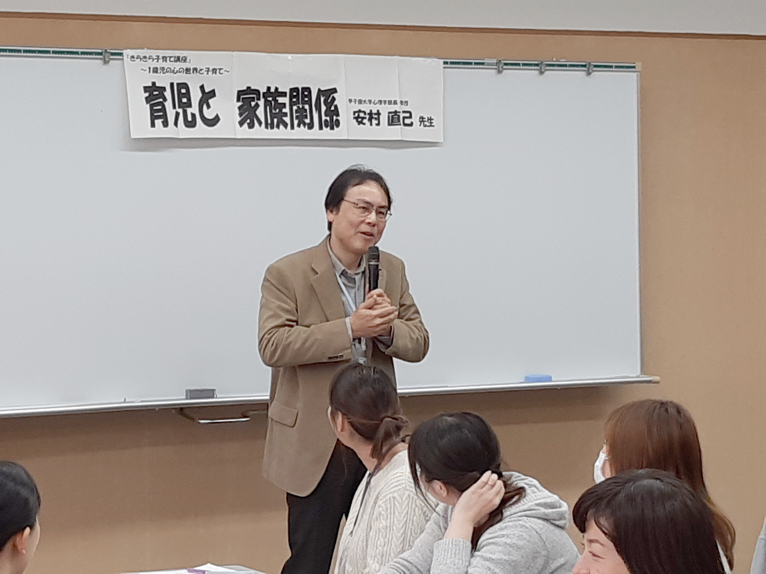 本日27日、本年度最終の「きらきら子育て講座」(宝塚市子ども家庭支援センターとの共催)がフレミラ宝塚で開催され、17名のお母さん方が参加しました。本日は第3クールの3日目で、安村直己教授(本学心理学部現代応用心理学科)によって進められました。安村教授から「育児と家族関係」というテーマで語りがあり、その後、親同士によるディスカッション。今抱えている子育ての諸問題をお互い共有するなかで、子どもの心の世界や関わり方について理解を深めていきました。1日目(2月13日:酒井律子教授)の「1歳児のこころとことば」、2日目(同月20日:青柳寛之准教授)の「親と子の波長合わせ」に引き続きの講座を、参加したお母さん方は熱心に取り組まれました。