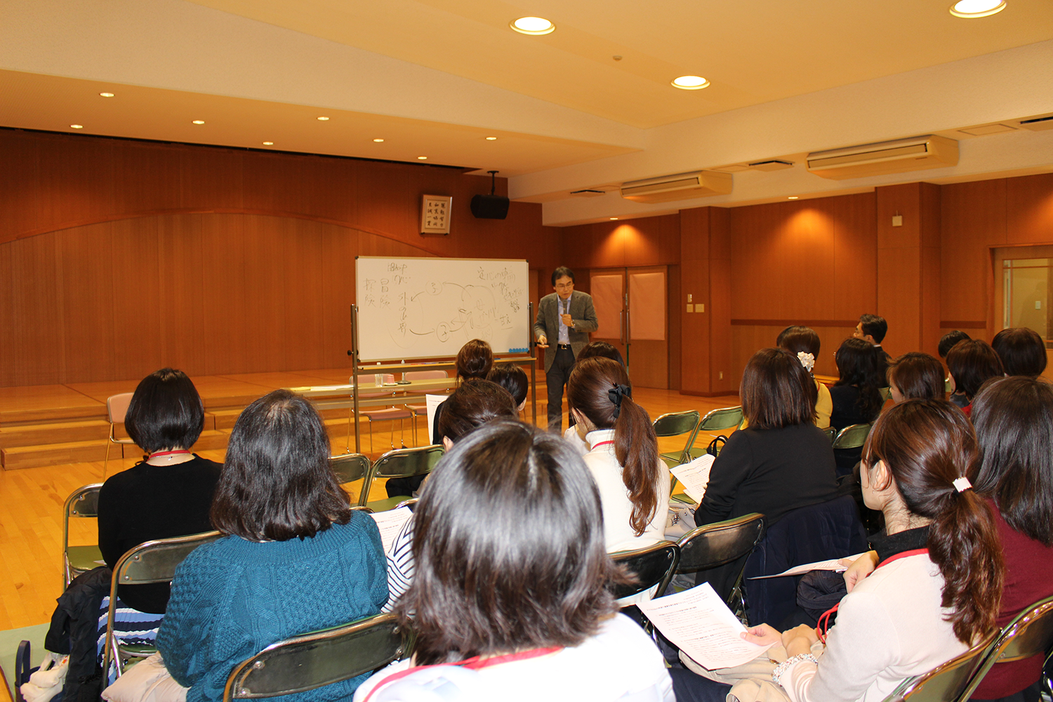 心理学部の安村直己学部長が28日、甲子園学院幼稚園で「子どもの心の発達と健康を育む家庭でのコミュニケーションについて」をテーマに講演を行いました。幼稚園からの強い要望があって、昨年度に引き続き実施されました。幼児期の子どもの心の発達の特徴と親子関係や、子どもの上手なしつけ方など具体的な事例を紹介した講演内容に、参加した方々からは、「これからも子どもに寄り添って頑張りたいと再確認できました」などという声が聞かれました。
