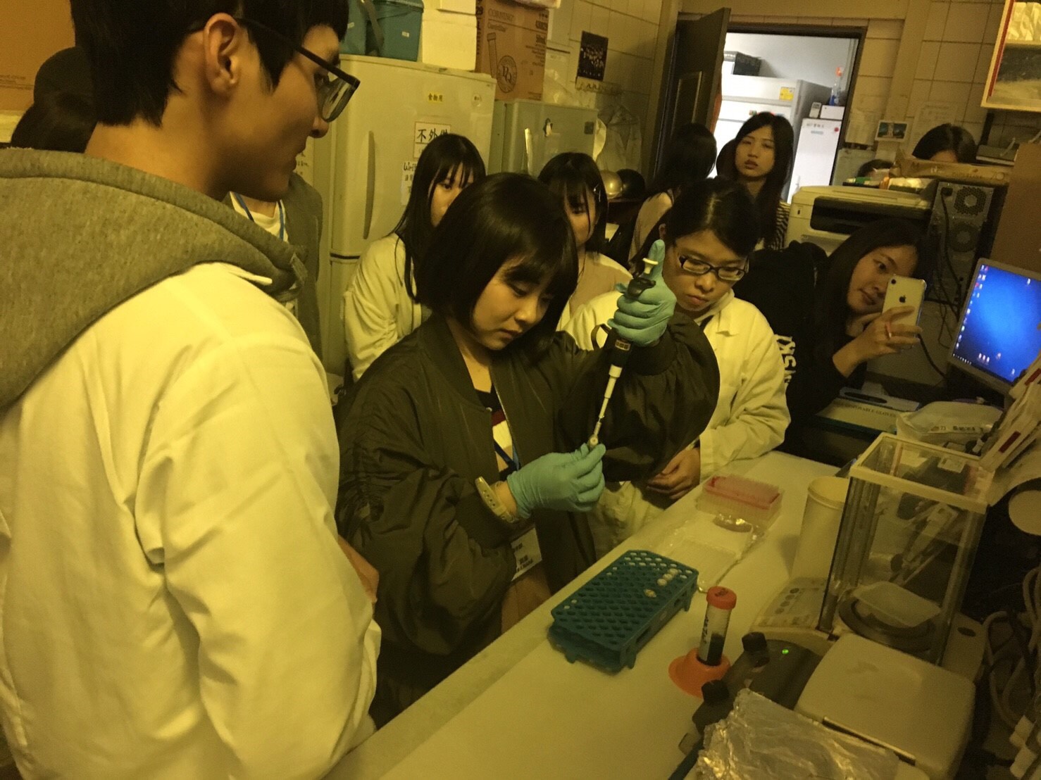 午後は5つのグループに分かれ、現地の学生(日本語学科からも10人以上の学生が来てくれました)と一緒に、食、学生生活、アレルギーなどについて、あらかじめ調査した課題に基づいて、学びを深めました(言葉にはみんな苦労しましたが、だんだん英語が出てきました。日本語学科の学生さんも、本当にありがとう)。その後キャンパスツアーに出ましたが、なかでも実験室の設備は圧巻でした。