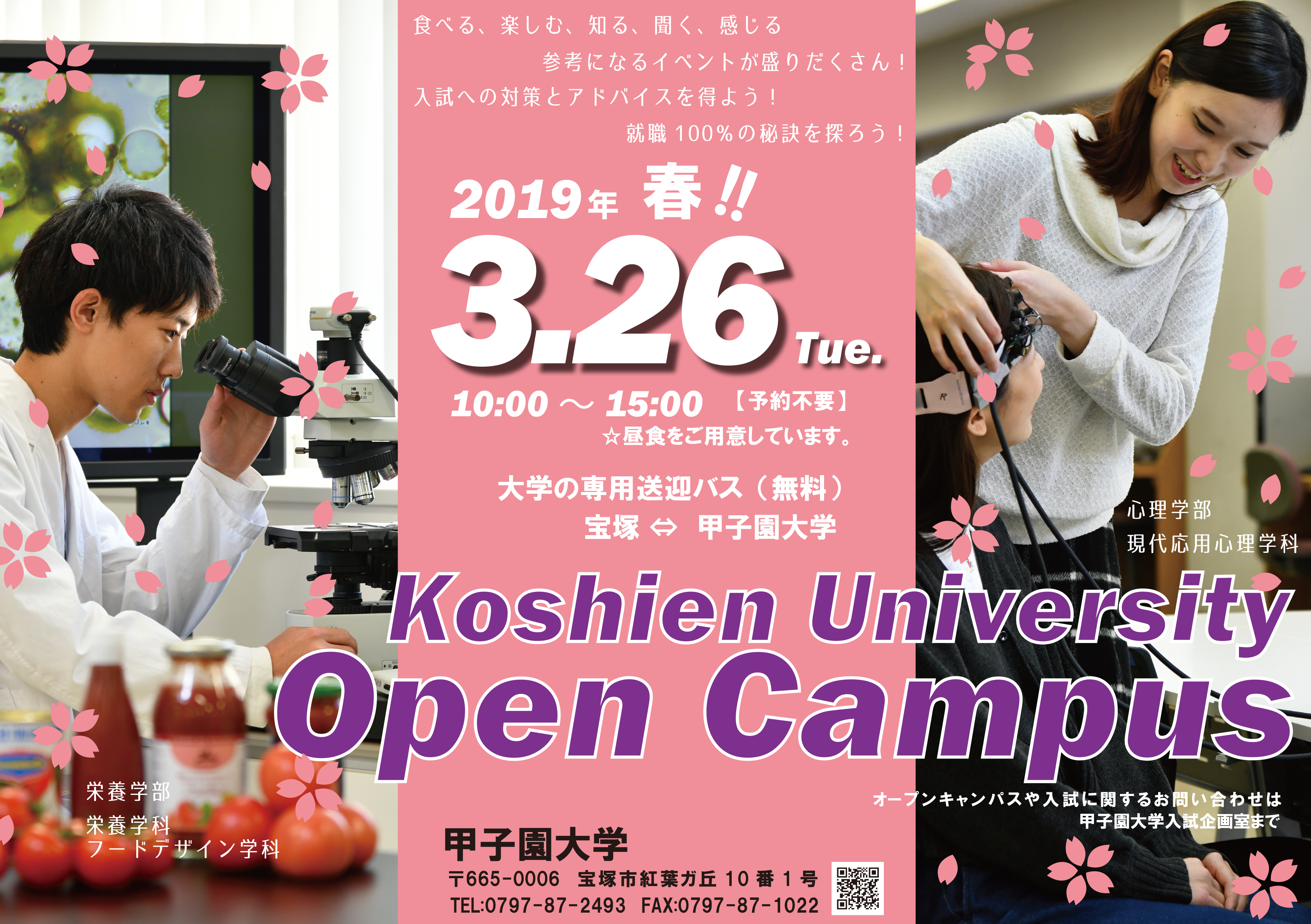お知らせ2019.03.20 春のオープンキャンパスは3月26日に開催します 春のオープンキャンパスを3月26日(火)10:00~15:00に行います。 栄養学部では、「管理栄養士と4つのコース(ミニ職業体験)」や「調理実践 ミニパイを作ろう」など、心理学部では「あなたの恋愛観を調べよう」や「ビジネス心理学実験」などの体験ができます。 予約は不要。プログラムや交通手段など詳細は添付した関連ファイルを参照してください。ご来場お待ちしております。 関連ファイル 発信部署:事務局 « 前の記事へ 次の記事へ »