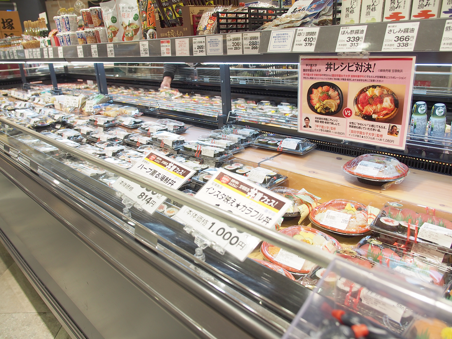 本学の栄養学部フードデザイン学科3回生の河合翔馬さんが考案した「ハーブ香る海鮮丼」が宝塚阪急・鮮魚売場「宝塚魚浜」で販売されています。宝塚阪急の「丼&重フェス」の一環として、「甲子園大学・園田学園女子大学レシピ対決」と銘打ち、両大学から選ばれた海鮮丼が期間限定で店頭に並び、その人気や売れ行きを競っています。レシピを考案した河合さんは、「和食の海鮮丼を洋風に仕立てて、アボカドをアクセントに用いました。ハーブの香りと華やかな盛り付け、うま味から、波の音を感じてください」と話しています。