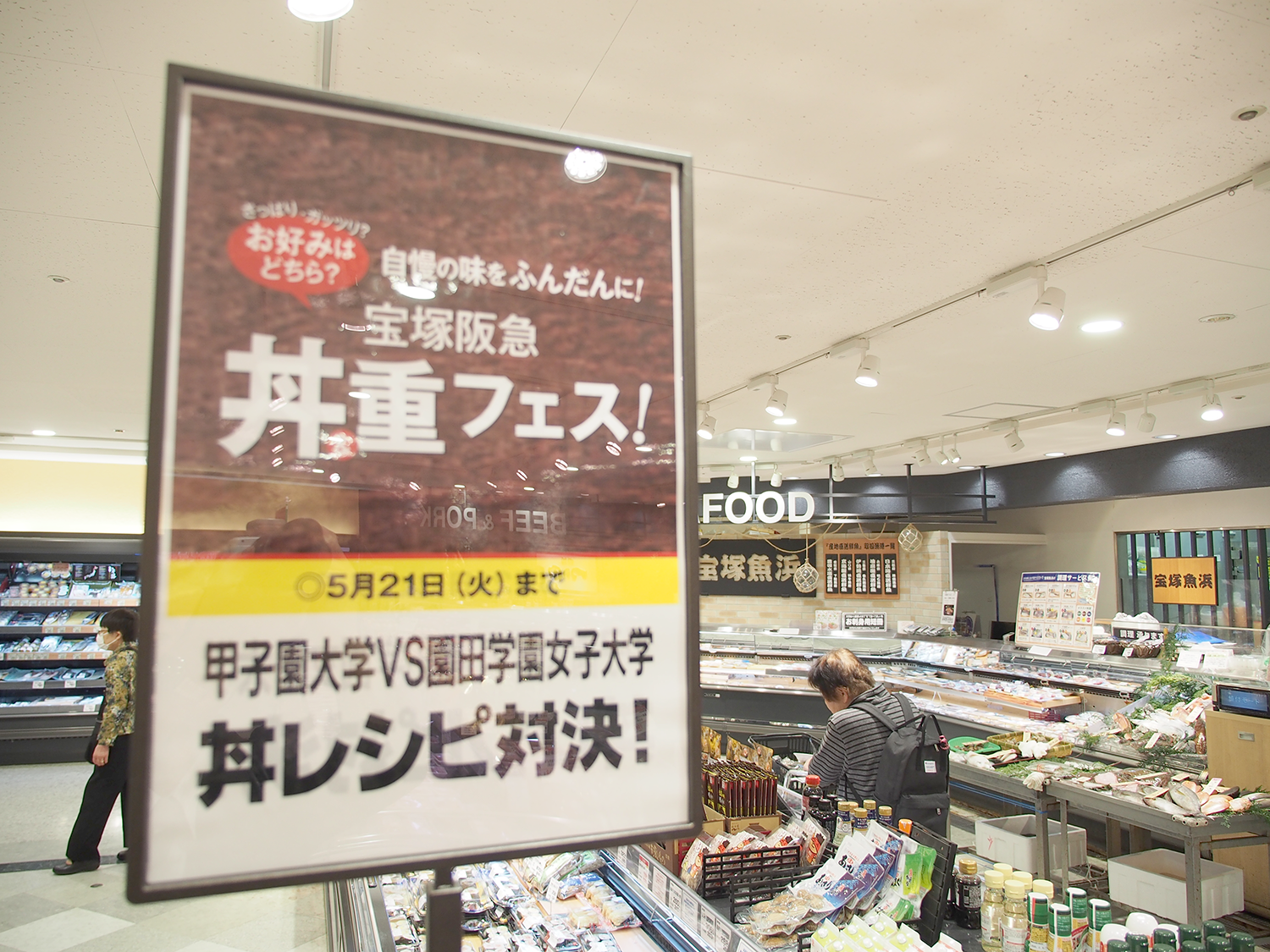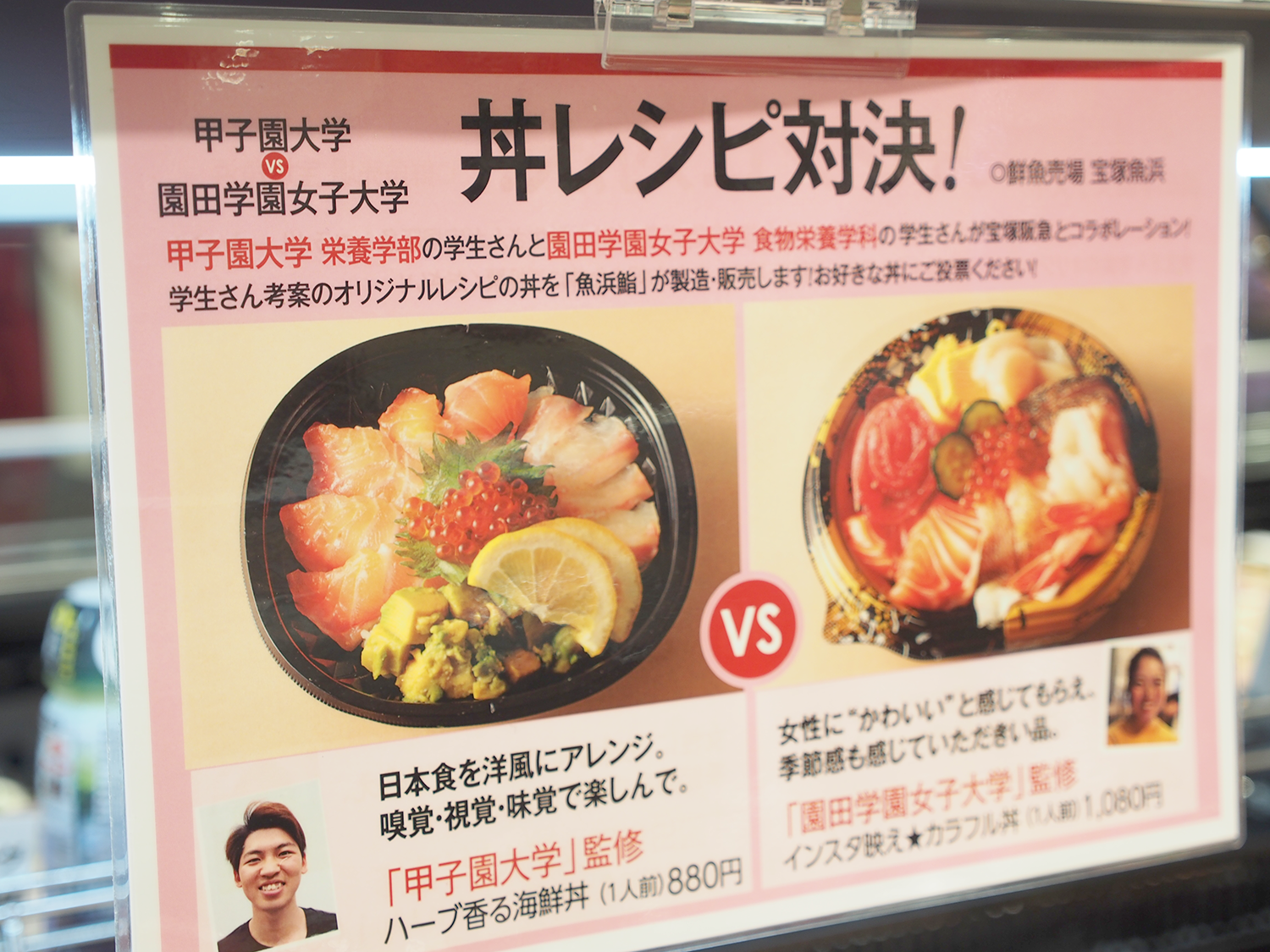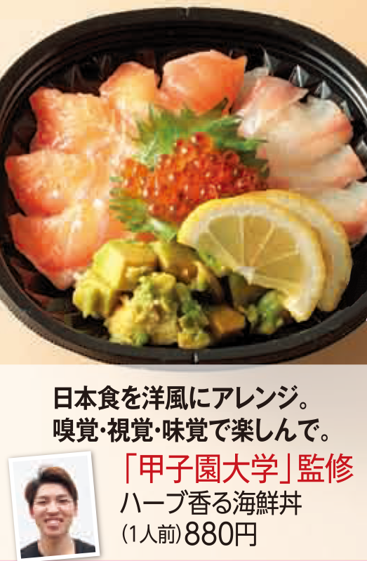 宝塚阪急が5月15日から21日まで開催した「丼&重フェス」で販売された「ハーブ香る海鮮丼」が、人気コンテストで1位を獲得しました。このオリジナル海鮮丼は、栄養学部フードデザイン学科3回生の河合翔馬さんがレシピを考案したもの。宝塚阪急では期間中に27種類の丼や重を販売し、人気投票を実施。「ハーブ香る海鮮丼」は45票を獲得し、2位(得票数18票)以下を大きく引き離し、№1に輝きました。なお、同フェスでは、「甲子園大学・園田学園女子大学レシピ対決」と銘打ち、両大学から選ばれた海鮮丼の人気や売れ行きを競いましたが、こちらも本学が勝利を収めました。応援してくださった皆さまにはお礼を申し上げます。