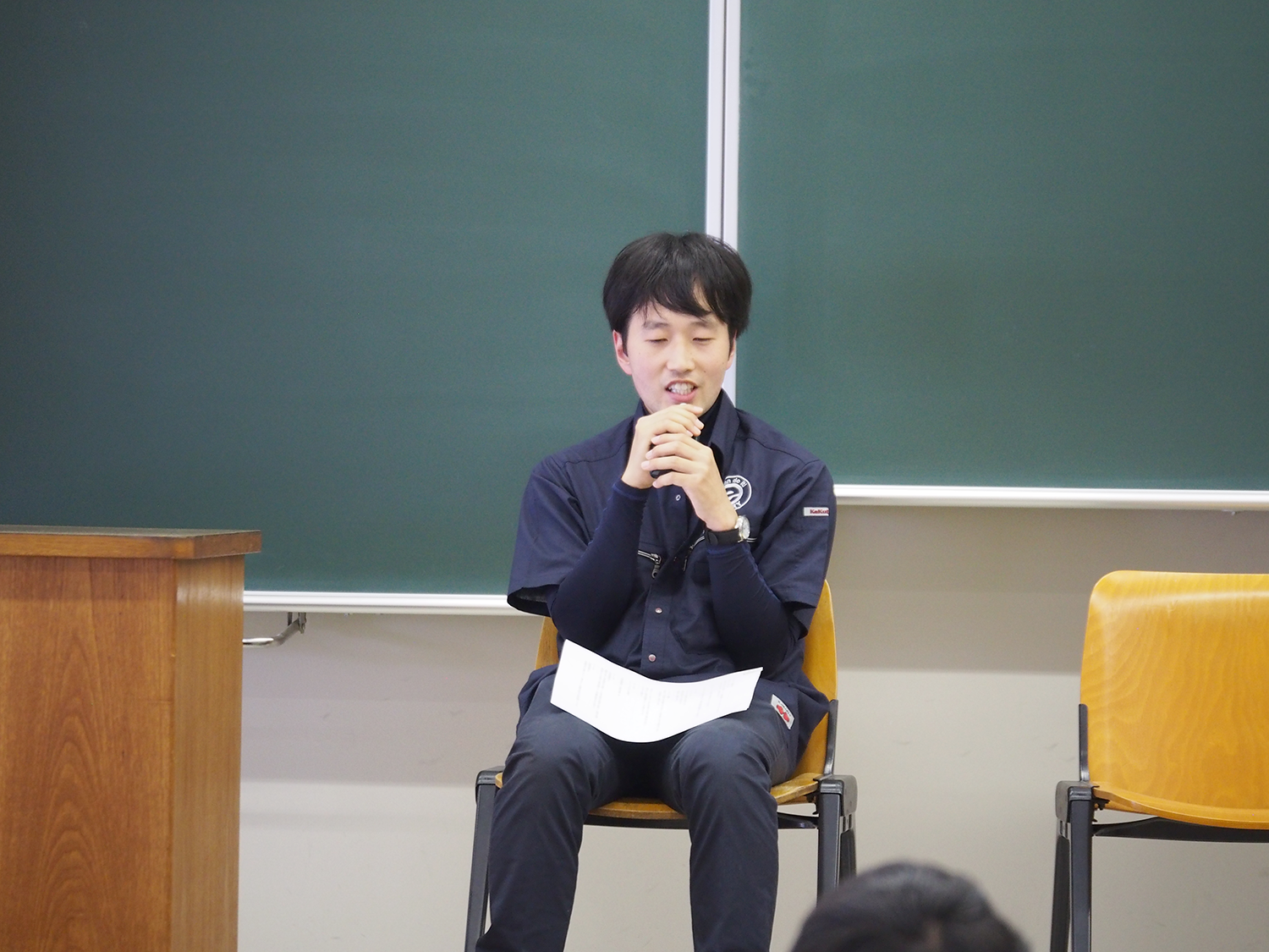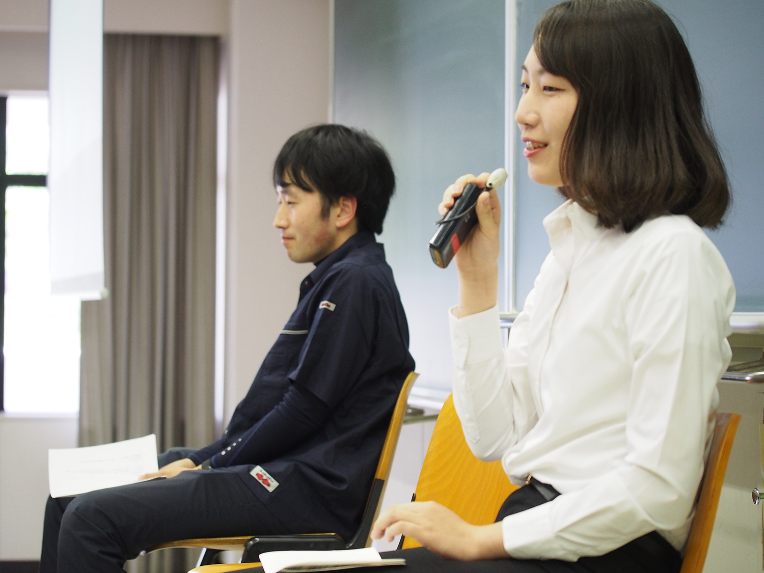 6月12日の「キャリアデザインⅡ」では、心理学部は卒業生2人を招き、就職活動や社会人になってからの体験談を聞きました。