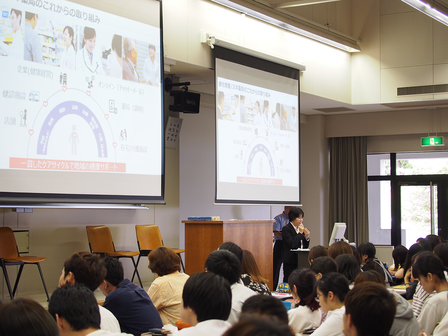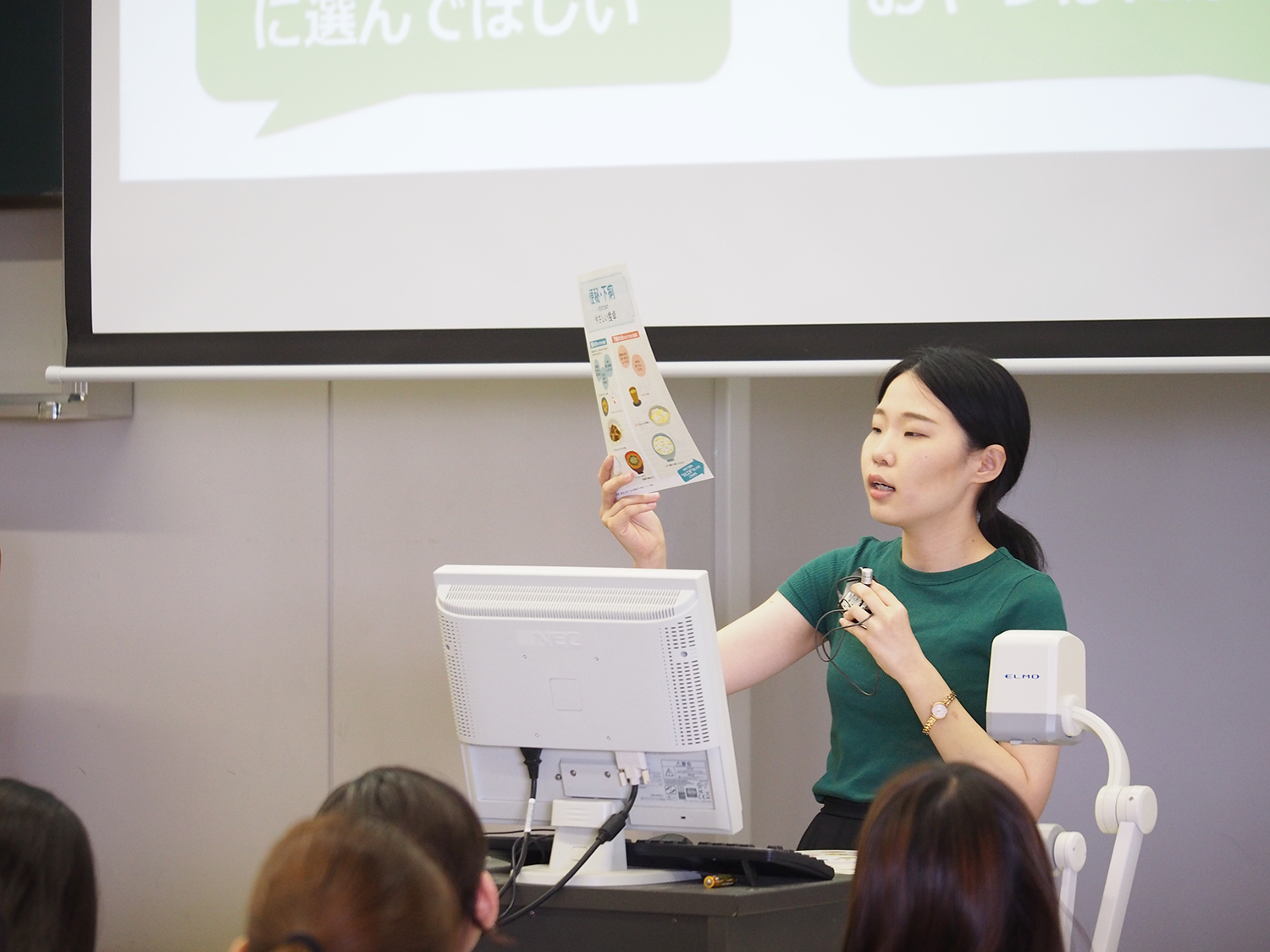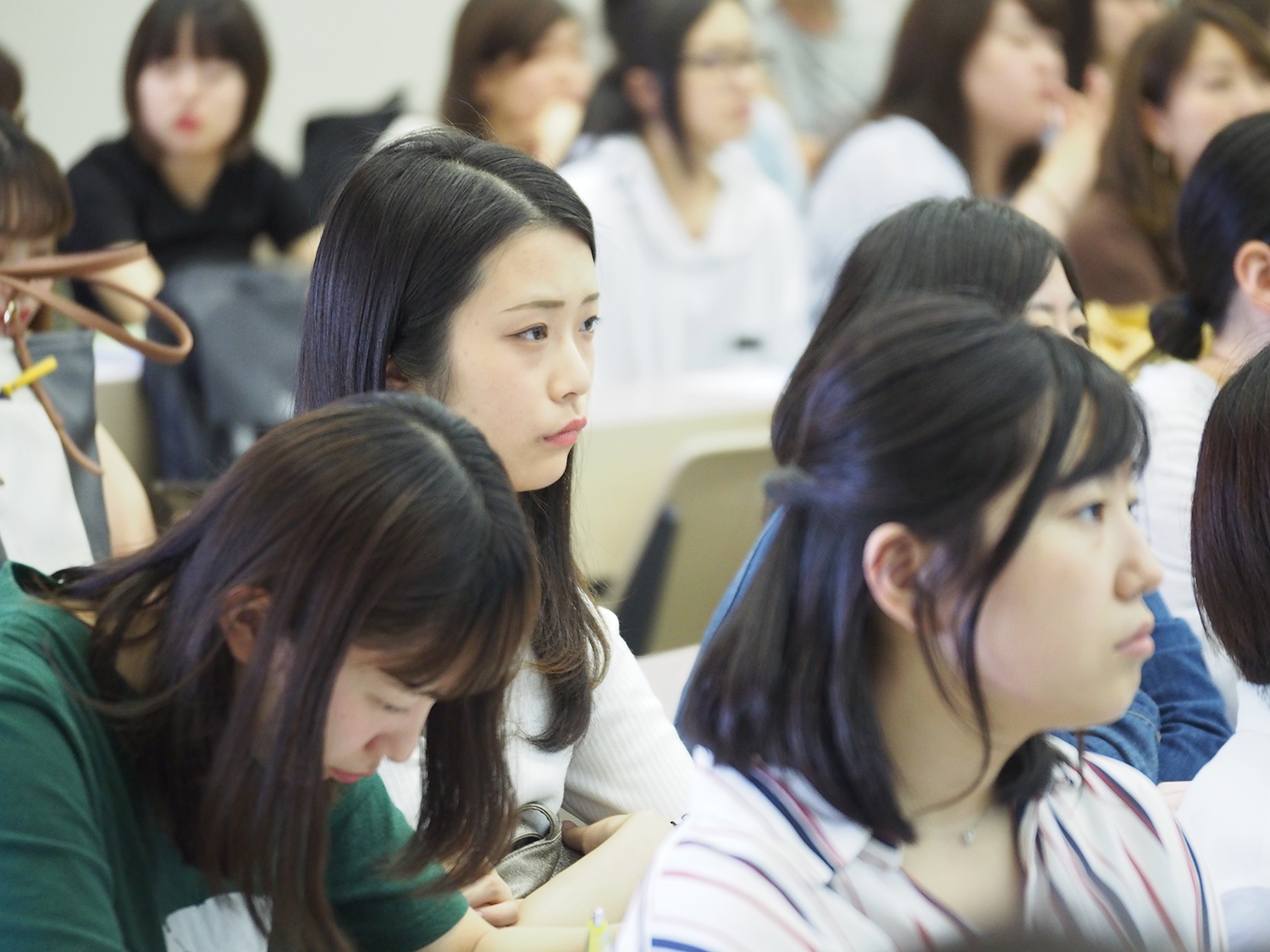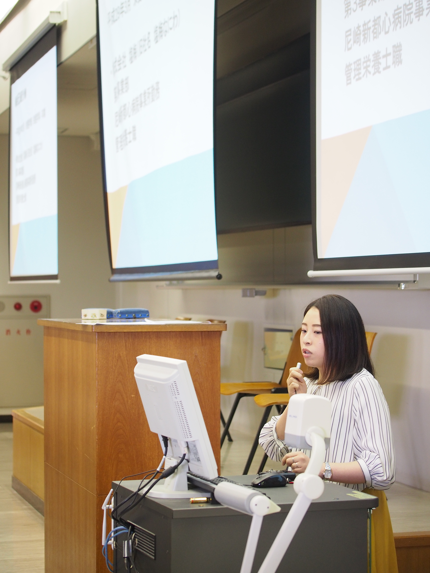 本学の栄養学科は管理栄養士の資格を目指し勉強し、フードデザイン学科は栄養士の資格を取得します。管理栄養士、栄養士の就職先は病院、保育園、栄養教諭、行政職員などがありますが、そのほか多岐にわたる業種で活躍している先輩たちも大勢います。今回の授業の目的は、卒業生から直接、話を聞くことによって、多様な仕事の可能性を探り、就職先の選択の幅を広げることです。卒業生の体験談を聞くことで、学生は自分が目指す仕事についていっそう真剣に考え、就職活動を始める準備が整った様子でした。