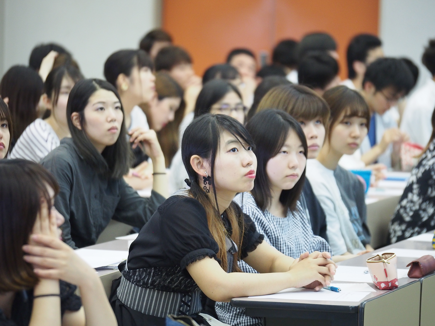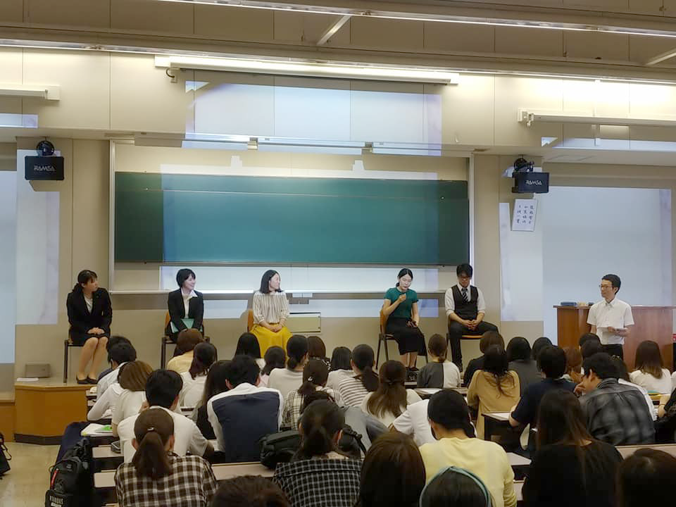 6月12日の「キャリアデザインⅡ」では、本学の栄養学部出身の卒業生5人を招き、就職活動の実体験から、現在働いている会社での仕事内容や今後の抱負に至るまでのキャリアデザインについて話を伺いました。「キャリアデザインⅡ」は、主に3回生が対象の授業で、「働く」ということを意識し、就活に向けてさまざまな知識を身に付けることが目的です。