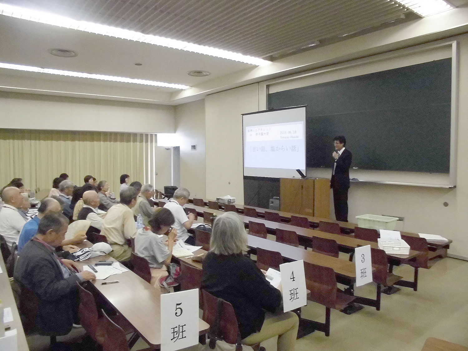 6月17日、「阪神シニアカレッジ in 甲子園大学」で、栄養学部フードデザイン学科の大橋哲也教授の講義が行われました。「甘い話、塩からい話」というタイトルで、砂糖と塩についての興味深い話題が紹介されました。甘い話は、日本国内で砂糖を生産していることの大切さ、ブラジルではさとうきびから、砂糖とエタノールを作り分けていることなどでした。塩からい話では、南米ボリビアにある「天空の鏡ウユニ塩湖」や、ポーランドにある「全長300kmのヴィエリチカ岩塩坑」など写真を使った説明がありました。