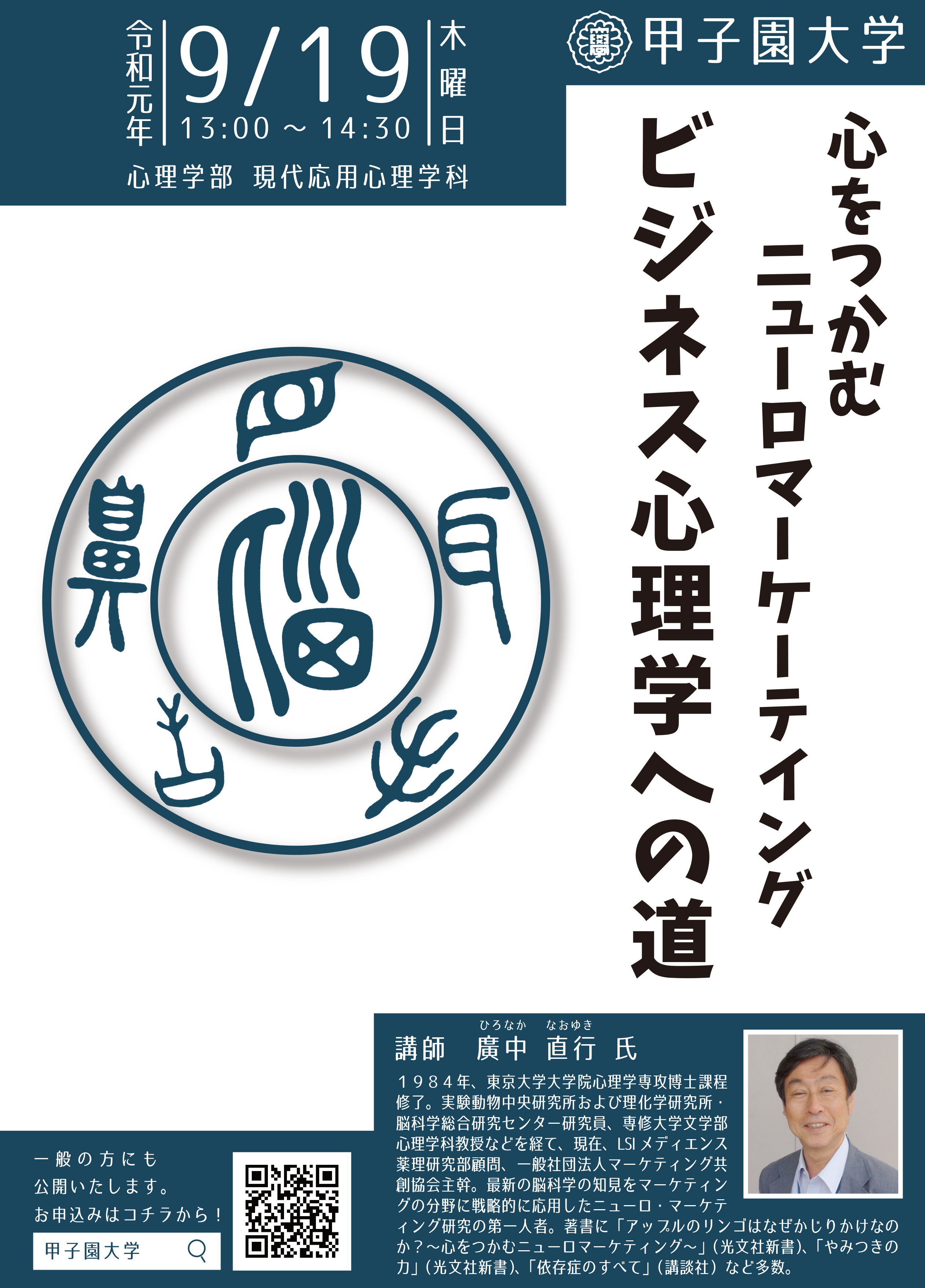 本学の心理学部現代応用心理学科が主催する廣中直行氏の特別授業を一般の皆さまにも公開いたします。